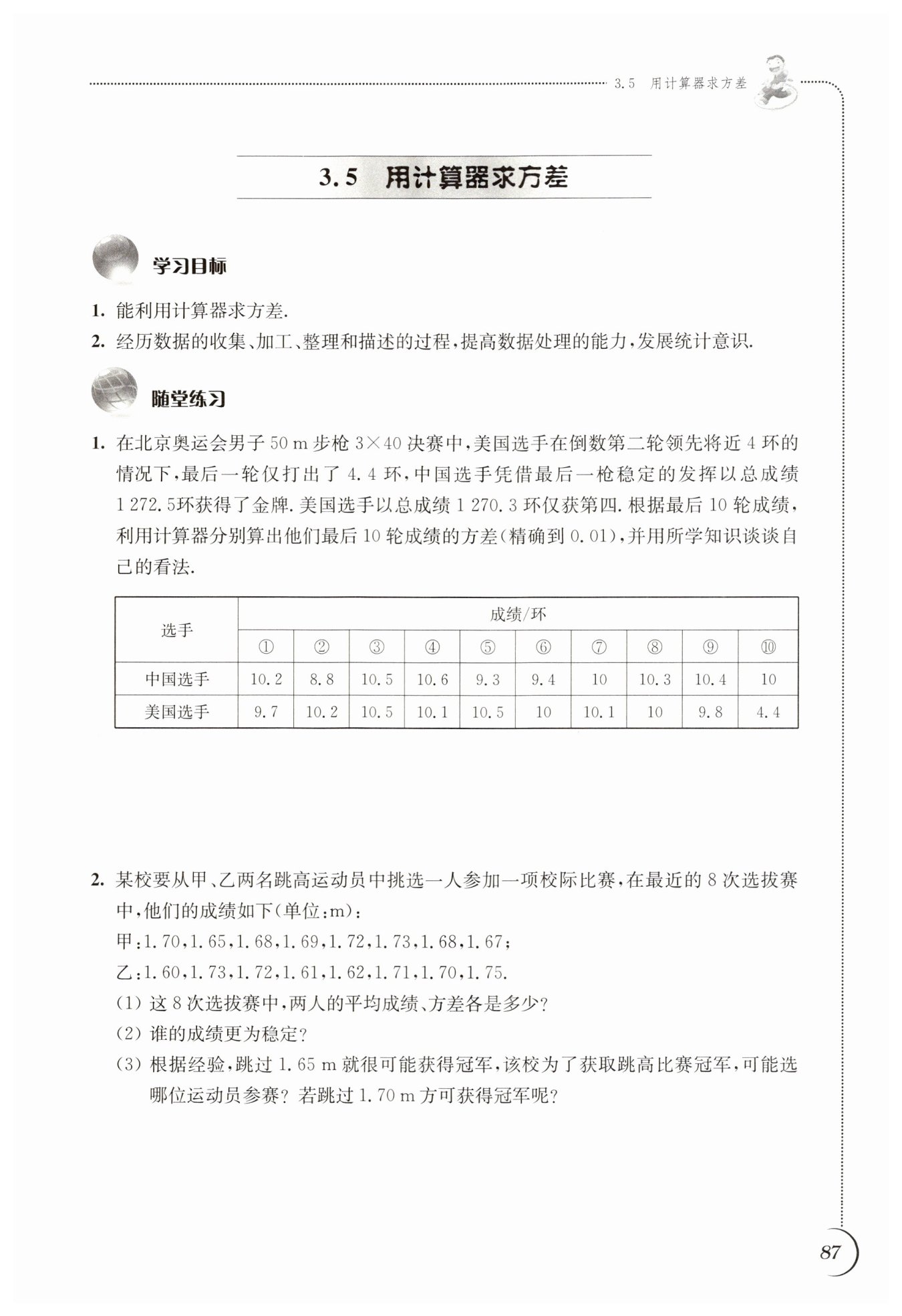 $甲的平均成績:\bar{x}_{甲} = \frac{1}{8} (1.70 + 1.65 + 1.68 + 1.69 + 1.72 + 1.73 + 1.68 + 1.67) = 1.69 m$