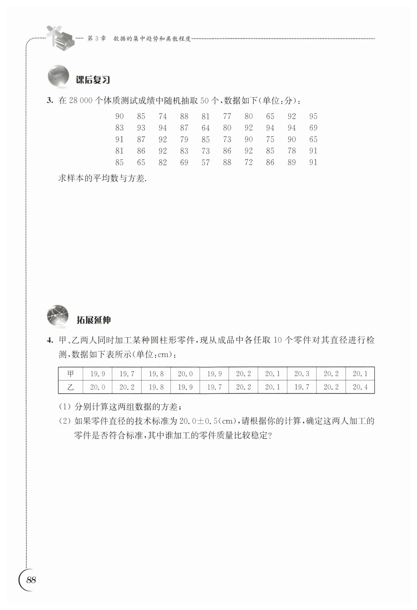 (2) 零件直徑的技術(shù)標(biāo)準(zhǔn)為 $20.0 \pm 0.5 \, \text{cm}$(即 $19.5 \, \text{cm} \sim 20.5 \, \text{cm}$)。甲、乙兩組數(shù)據(jù)的所有直徑均在此范圍內(nèi),故兩人加工的零件都符合標(biāo)準(zhǔn)。
