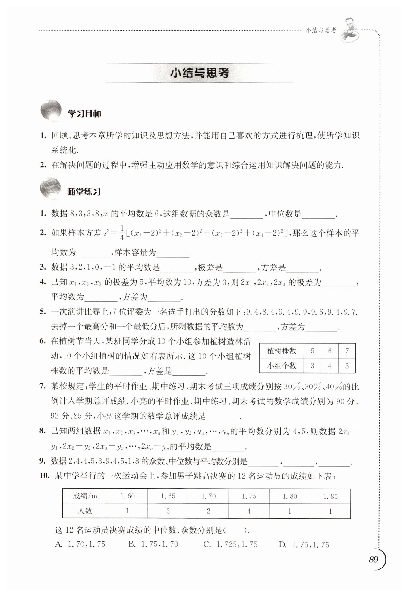 解:共有12名運(yùn)動(dòng)員,中位數(shù)是第6、7個(gè)數(shù)據(jù)的平均數(shù)。將成績(jī)按順序排列,累計(jì)人數(shù):1.60(1),1.65(4),1.70(6),1.75(10),所以第6個(gè)數(shù)據(jù)是1.70,第7個(gè)數(shù)據(jù)是1.75,中位數(shù)為$(1.70 + 1.75)÷2 = 1.725$。