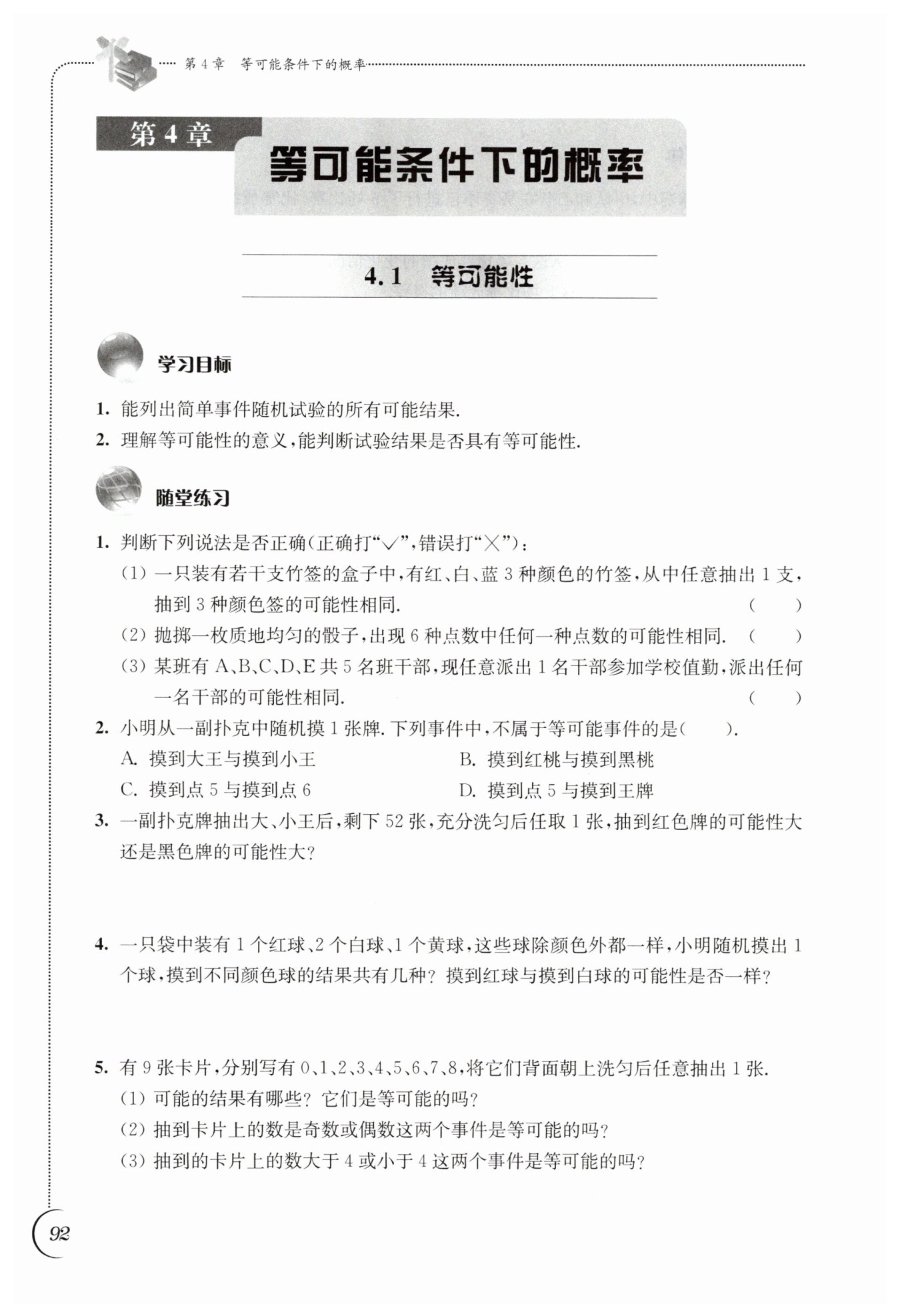 (3) 小于4的數(shù)為0、1、2、3共4個,大于4的數(shù)為5、6、7、8共4個,因此抽到的卡片上的數(shù)大于4或小于4這兩個事件是等可能的。