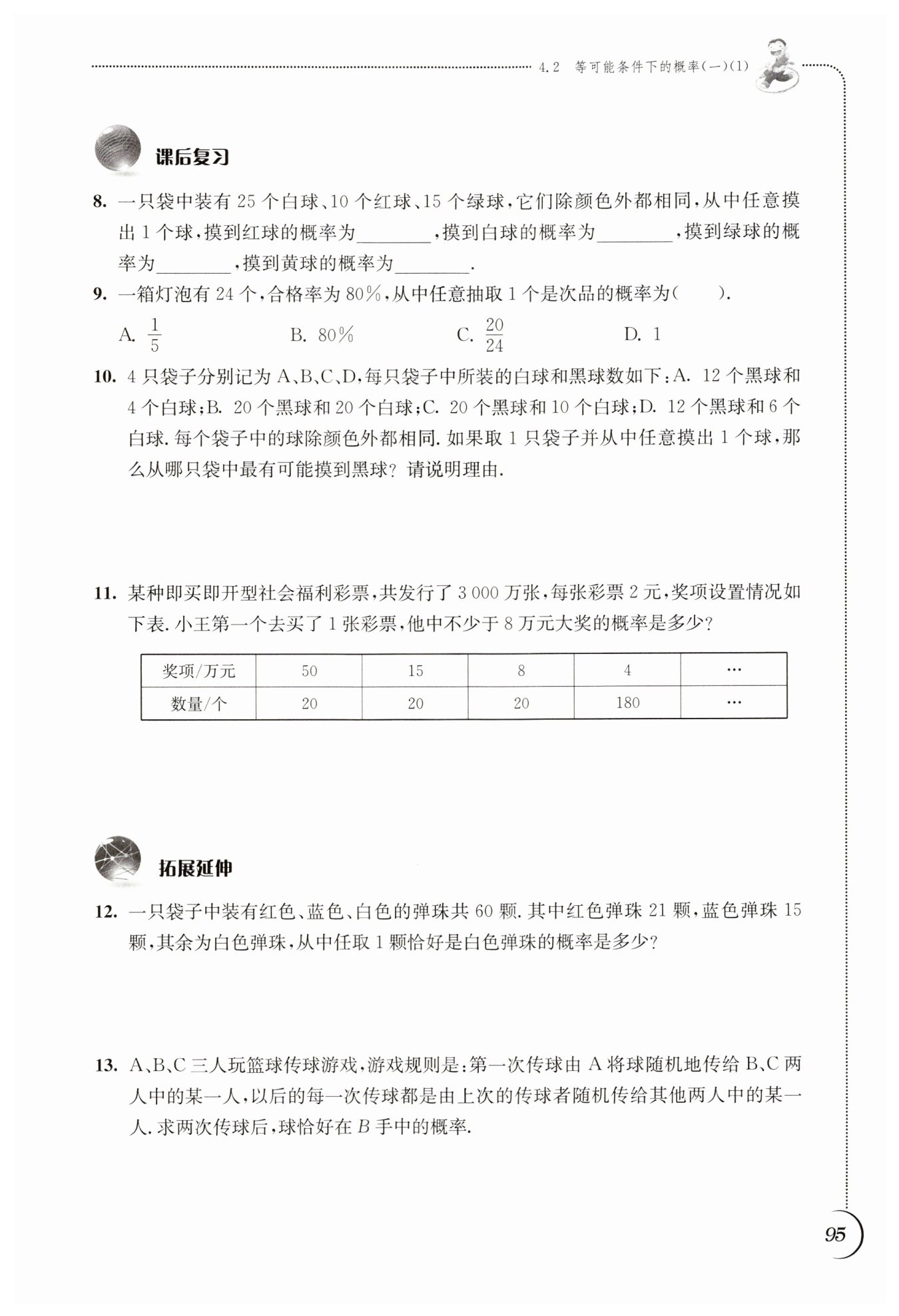 解:白色彈珠的顆數(shù)為:$60 - 21 - 15 = 24$(顆)