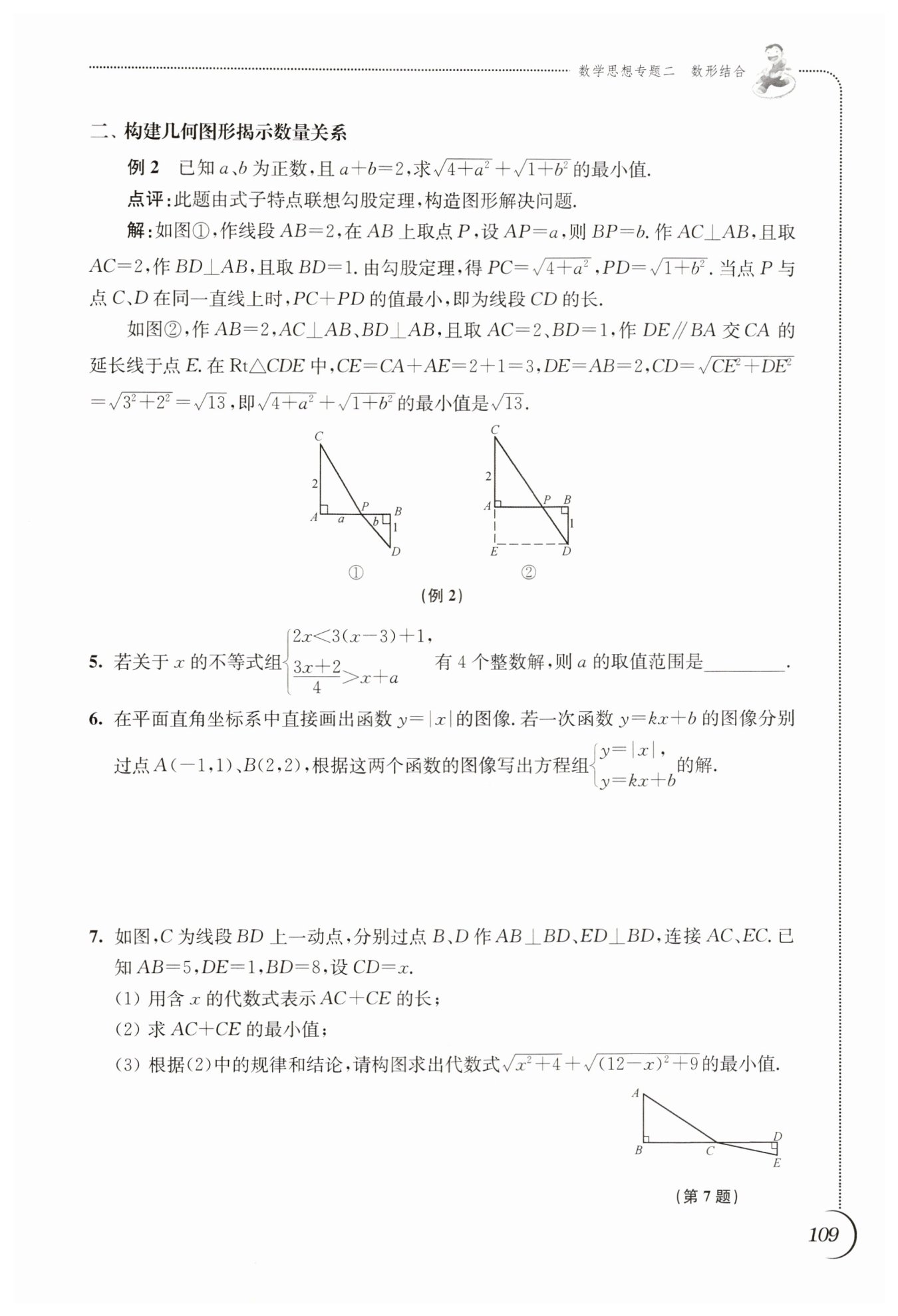 此時 $ AC = \sqrt{BC^2 + AB^2} = \sqrt{(12 - x)^2 + 2^2} = \sqrt{(12 - x)^2 + 4} ,$$ CE = \sqrt{CD^2 + DE^2} = \sqrt{x^2 + 3^2} = \sqrt{x^2 + 9} ,$代數(shù)式 $ \sqrt{x^2 + 4} + \sqrt{(12 - x)^2 + 9} $ 的最小值即為 $ AC + CE $ 的最小值。