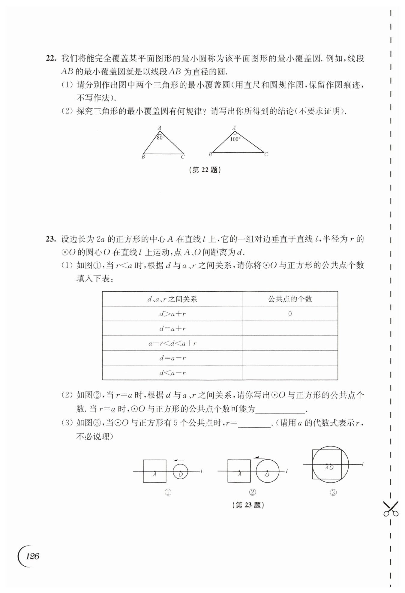 第一個三角形(∠A=80°,銳角三角形)的最小覆蓋圓:作其外接圓,即分別作AB、AC的垂直平分線,交于點O,以O(shè)為圓心,OA為半徑畫圓(保留垂直平分線痕跡及圓心O)。