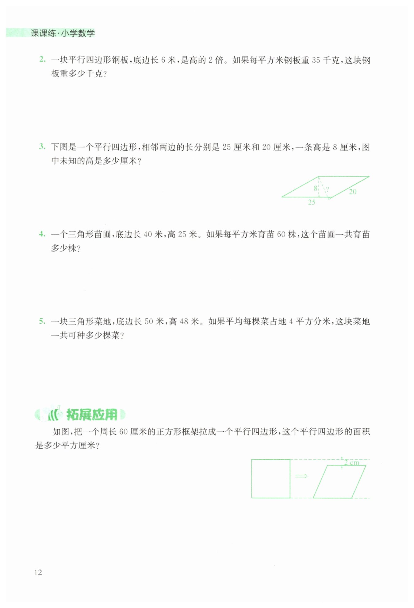 三角形菜地面積:$S = \frac{1}{2} × 底 × 高 = \frac{1}{2} × 50 × 48 = 1200$(平方米)