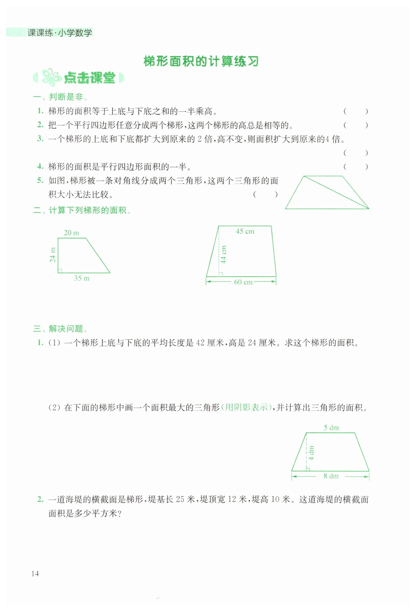 5.梯形被一條對角線分成兩個(gè)三角形,這兩個(gè)三角形的高都等于梯形的高,設(shè)梯形上底為$a$,下底為$b$,高為$h$,則這兩個(gè)三角形的面積分別為$ah{÷} 2$和$bh{÷} 2$,當(dāng)$a\ne b$時(shí),這兩個(gè)三角形面積不相等,是可以比較大小的,該說法錯(cuò)誤。