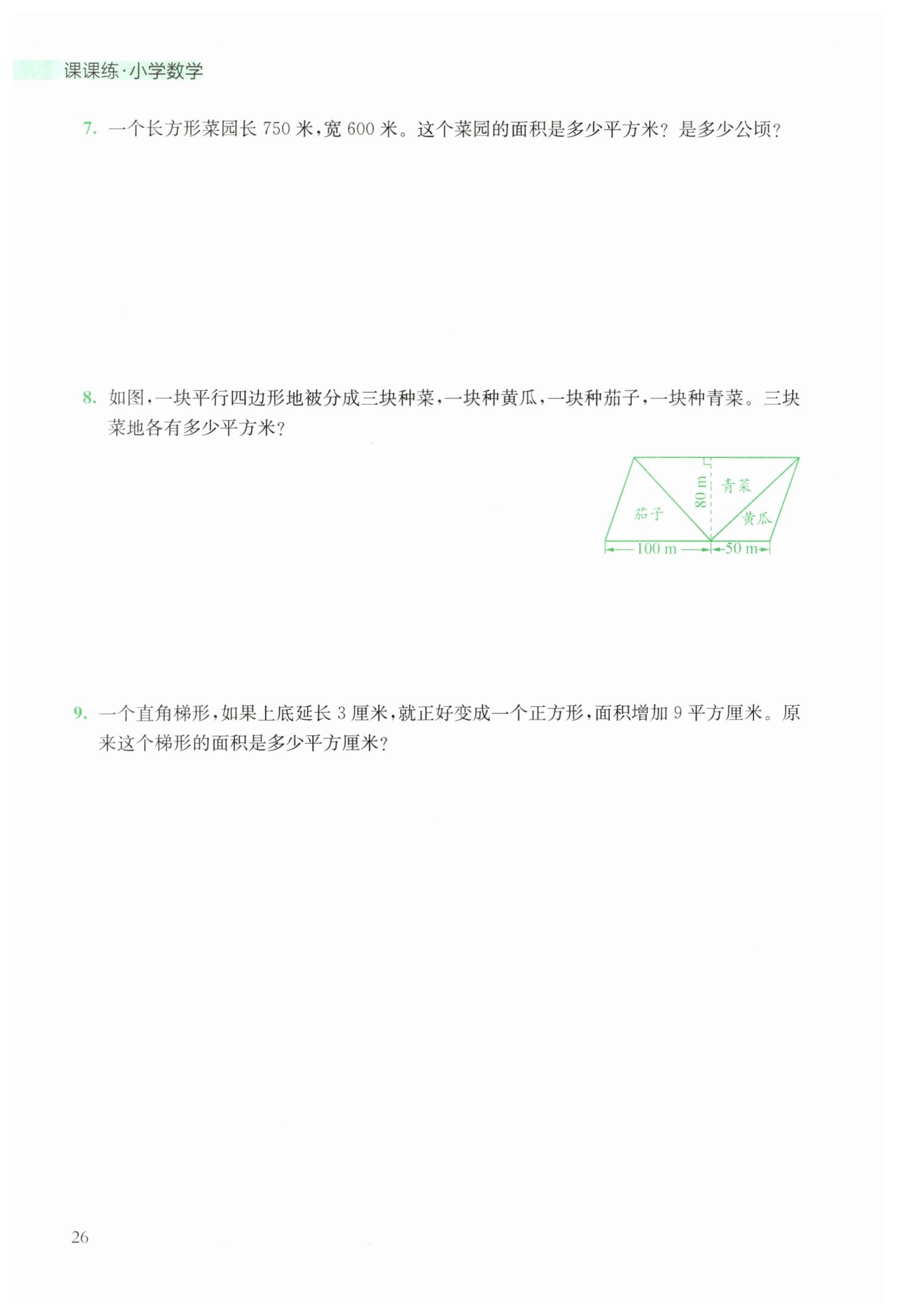 青菜地的底為平行四邊形的底減去茄子和黃瓜地的底,即$100 + 50 = 150$(米),面積為:$\frac{1}{2} \times 150 \times 80 = 6000$(平方米)。