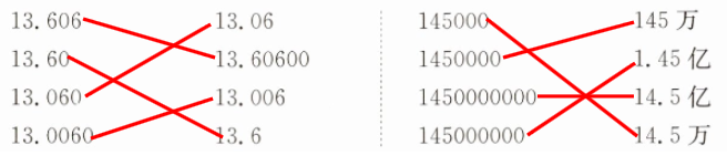 本題考察的是數(shù)的相等性以及單位換算。首先,我們要明確小數(shù)點后的0不影響數(shù)值大小,例如13.606和13.60600是相等的。其次,我們要知道萬、億等單位換算成基本單位數(shù)值是多少,例如1萬等于10000,1億等于100000000。根據(jù)這些規(guī)則,我們可以將給出的數(shù)進行歸類。