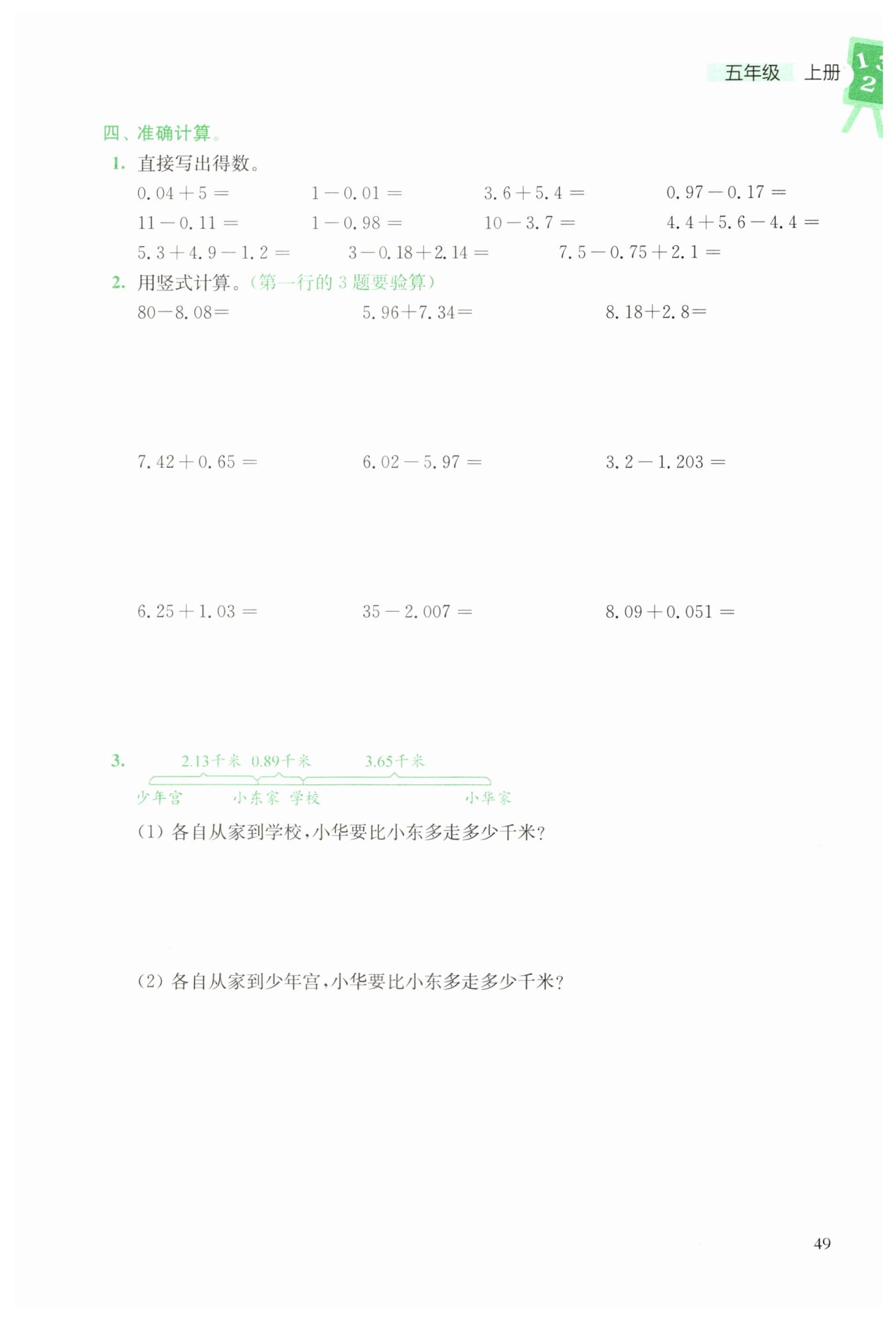 小華比小東多走的距離為:$3.65 + 0.89 + 2.13 - 2.13 = 4.54$(千米)。