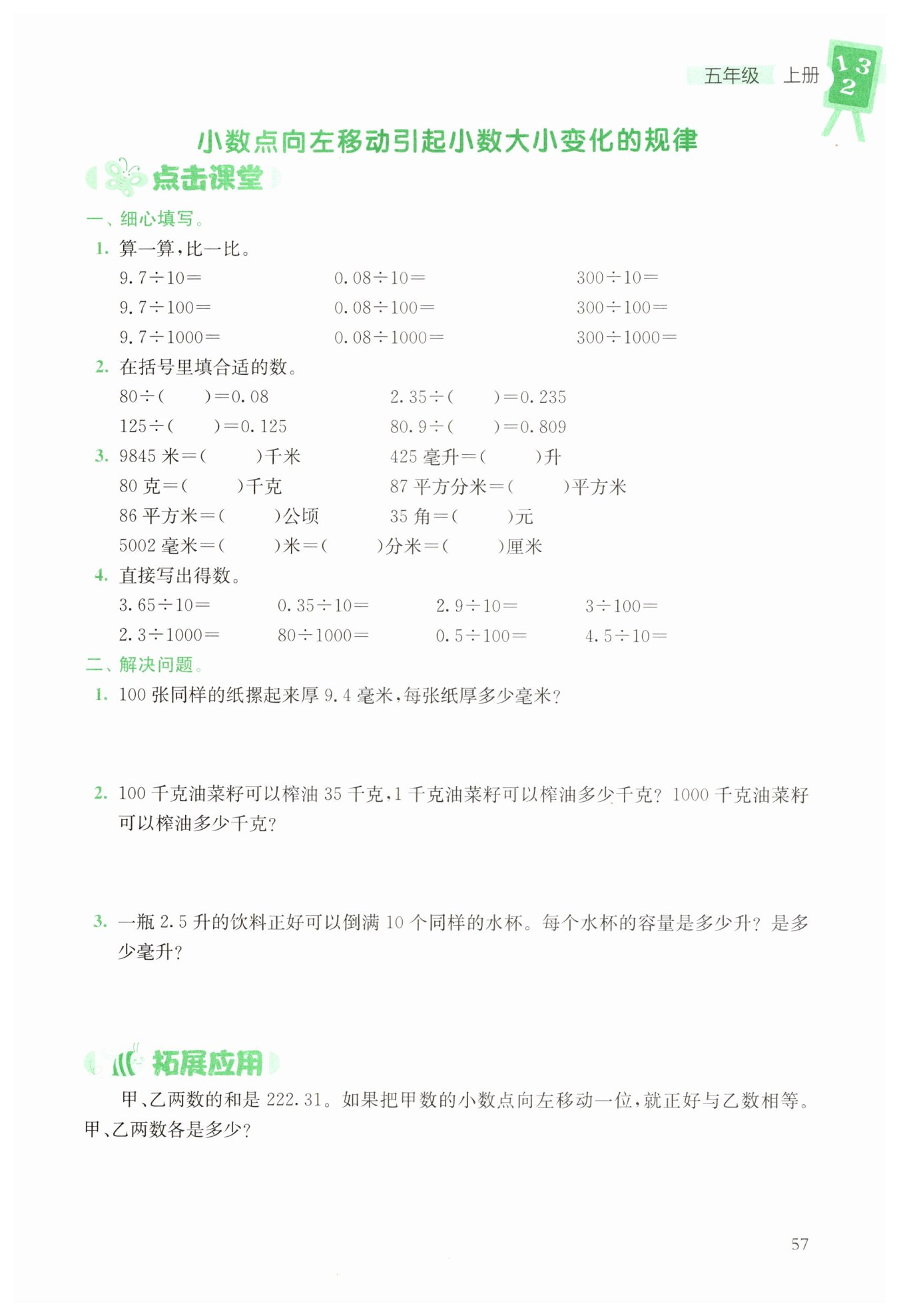 根據(jù)小數(shù)點向左移動引起小數(shù)大小變化的規(guī)律:除以10,小數(shù)點向左移動一位;除以100,小數(shù)點向左移動兩位;除以1000,小數(shù)點向左移動三位。