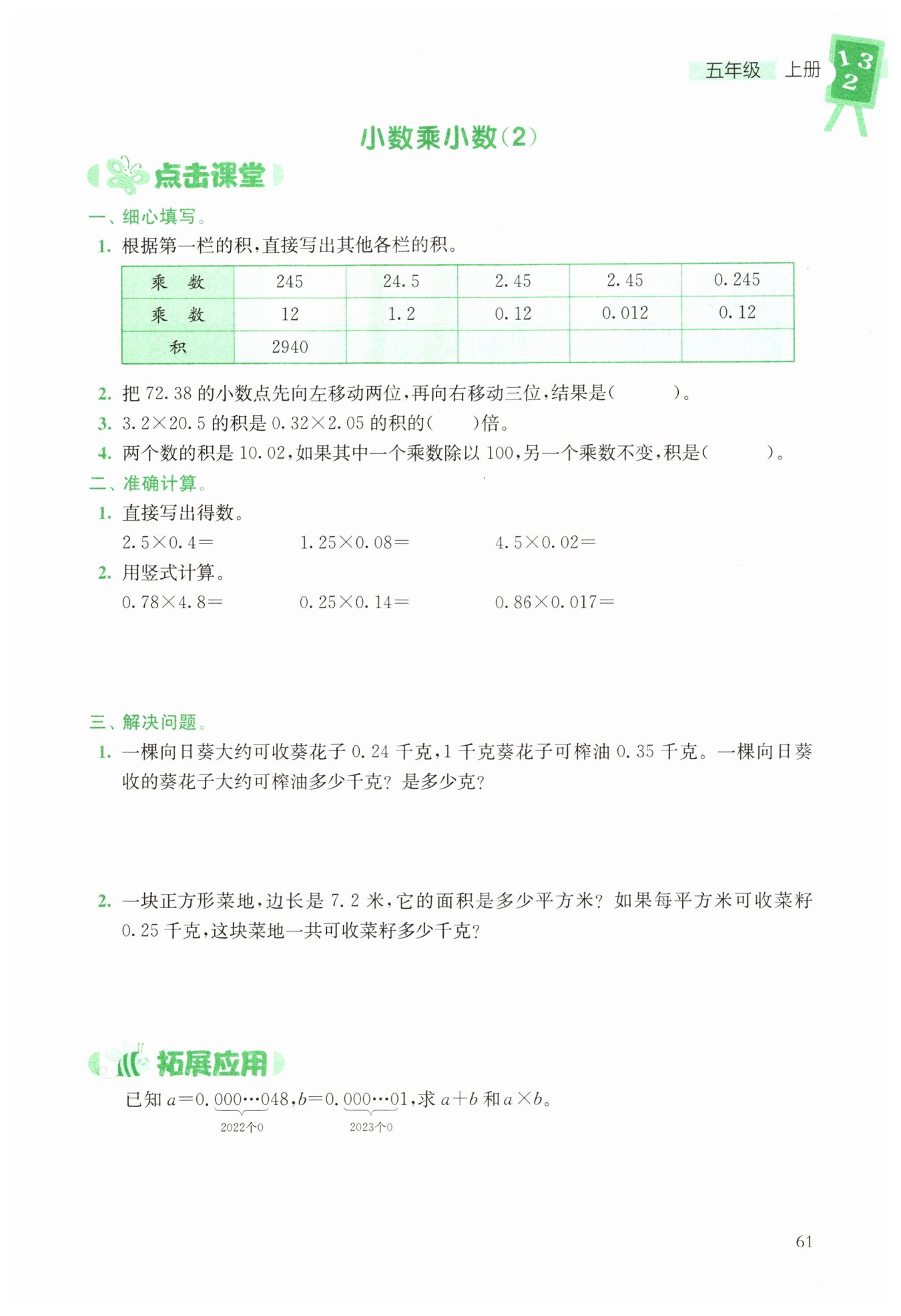 第五欄:$0.245$相比較$245$,小數(shù)點(diǎn)向左移動(dòng)了三位,即縮小了$1000$倍;$0.12$相比較$12$,小數(shù)點(diǎn)向左移動(dòng)了兩位,即縮小了$100$倍。兩個(gè)因數(shù)分別縮小了$1000$倍和$100$倍,那么積縮小$1000×100 = 100000$倍,$2940÷100000 = 0.0294$。