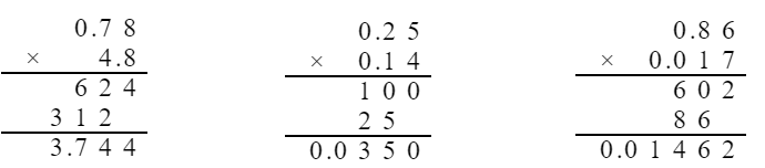 第四欄:$2.45$相比較$245$,小數(shù)點(diǎn)向左移動(dòng)了兩位,即縮小了$100$倍;$0.012$相比較$12$,小數(shù)點(diǎn)向左移動(dòng)了三位,即縮小了$1000$倍。兩個(gè)因數(shù)分別縮小了$100$倍和$1000$倍,那么積縮小$100×1000 = 100000$倍,$2940÷100000 = 0.0294$。