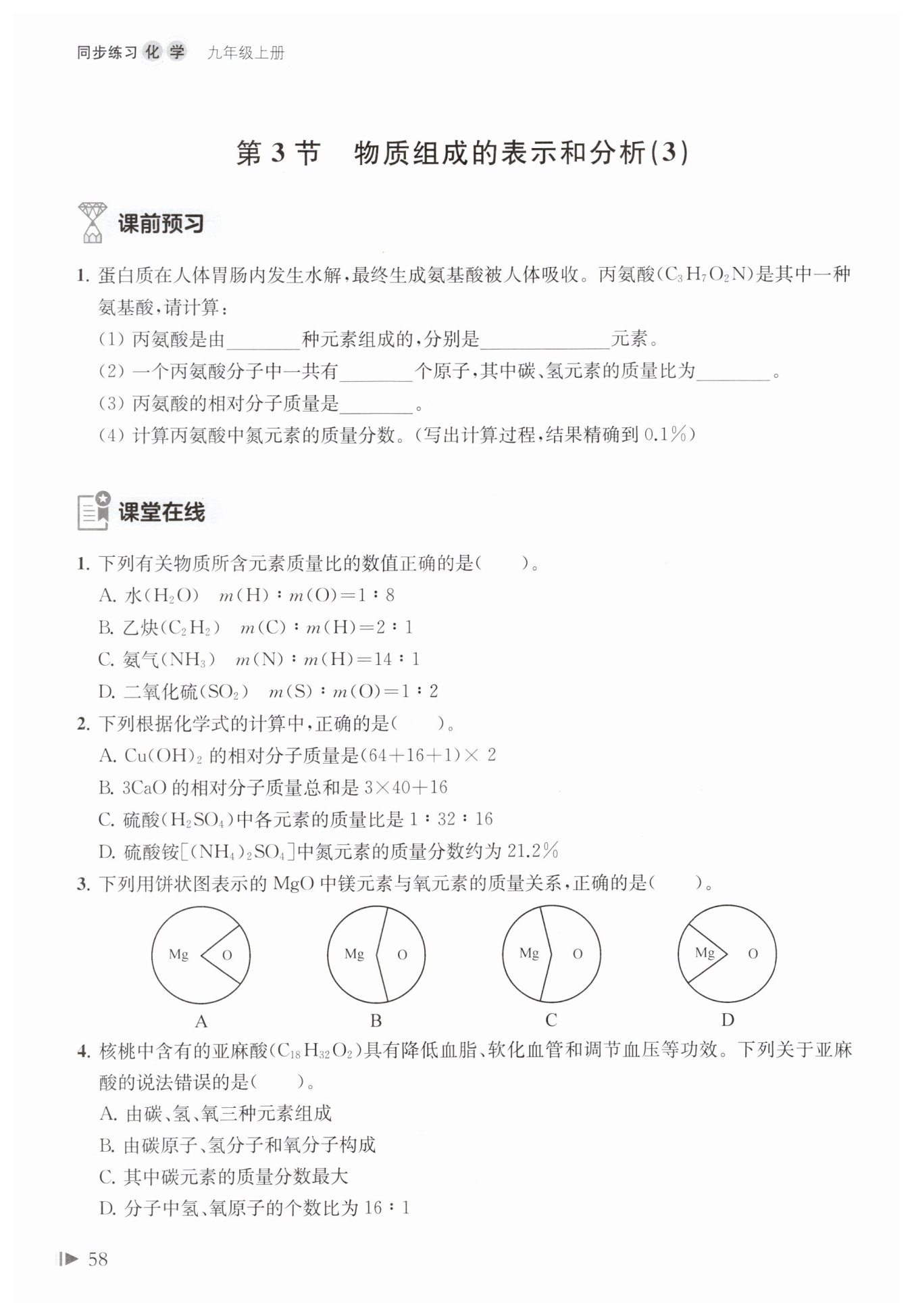 解:(1)丙氨酸是由碳、氫、氧、氮四種元素組成;(2)一個(gè)丙氨酸分子中一共有3+7+2+1=13個(gè)原子,其中碳、氫元素的質(zhì)量比為(12×3):(1×7)=36:7;(3)丙氨酸的相對(duì)分子質(zhì)量為12×3+7+16×2+14=89;(4)氮元素的質(zhì)量分?jǐn)?shù)為$\frac{14}{89}$×100%≈15.7%。