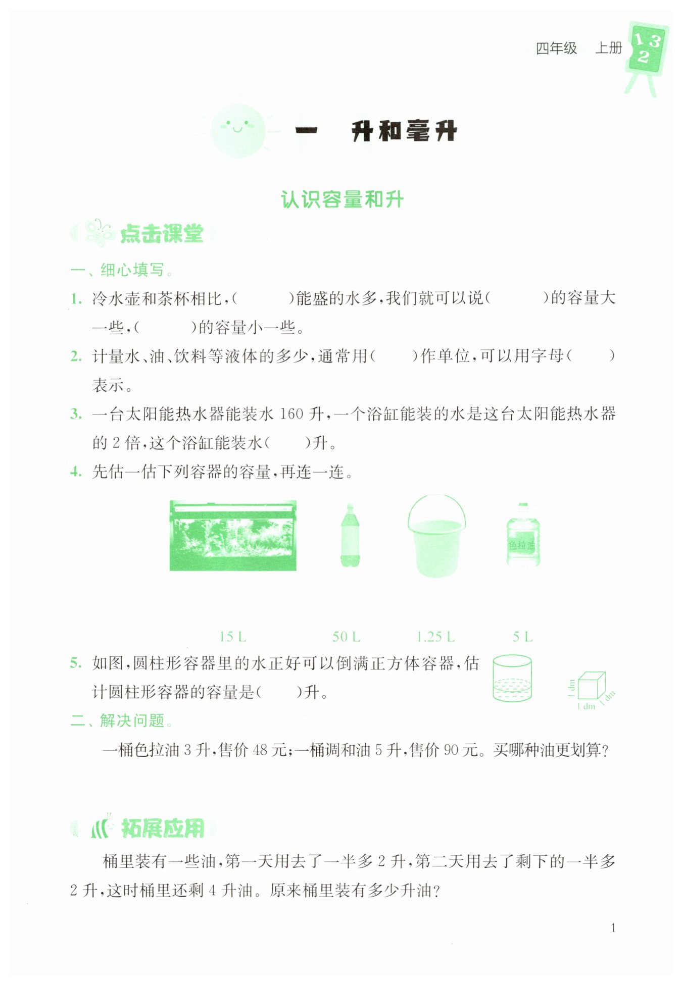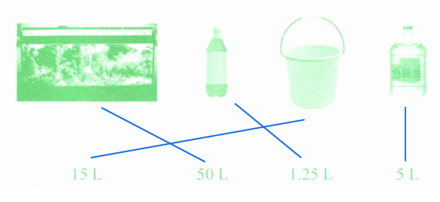 根據(jù)生活經(jīng)驗,魚缸容量最大,約50L;水桶容量次之,約15L;色拉油桶容量約5L;小瓶飲料容量最小,約1.25L。連線為:魚缸-50L,小瓶飲料-1.25L,水桶-15L,色拉油桶-5L。