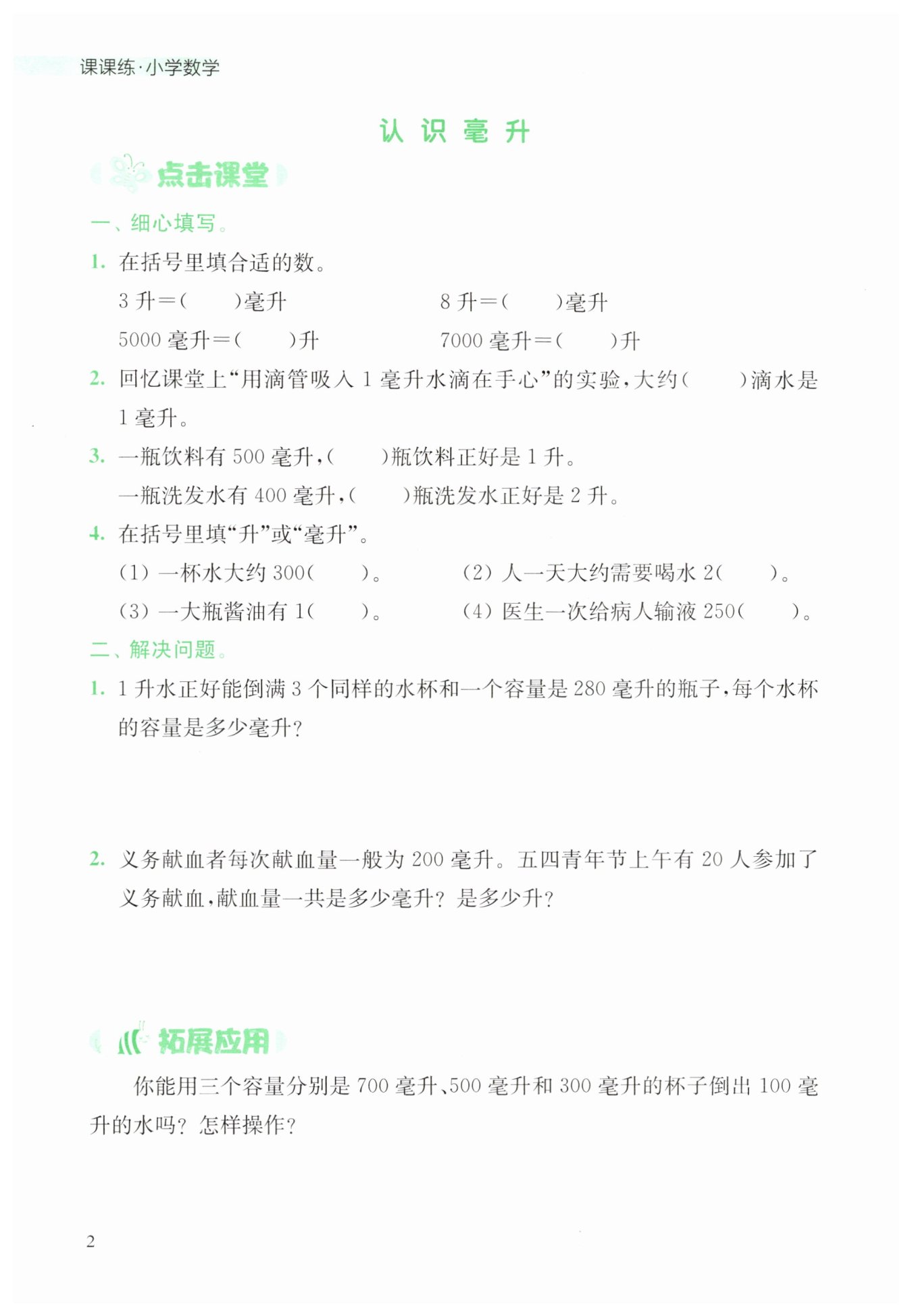 (2) 人一天需要喝的水量相對較大,所以應(yīng)該是2升而不是2毫升。