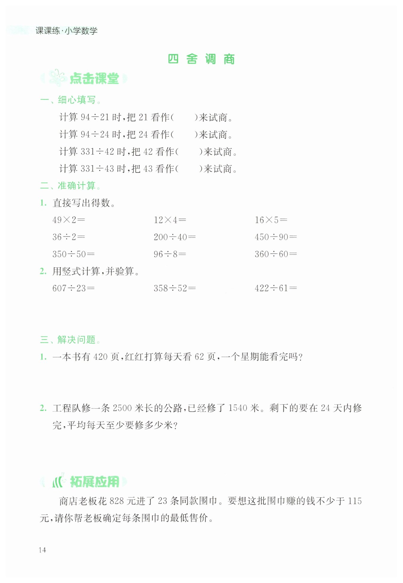 本題主要考察除法運(yùn)算中試商的方法。試商時(shí),我們通常會(huì)把除數(shù)看作一個(gè)接近的整十?dāng)?shù)來(lái)簡(jiǎn)化計(jì)算。