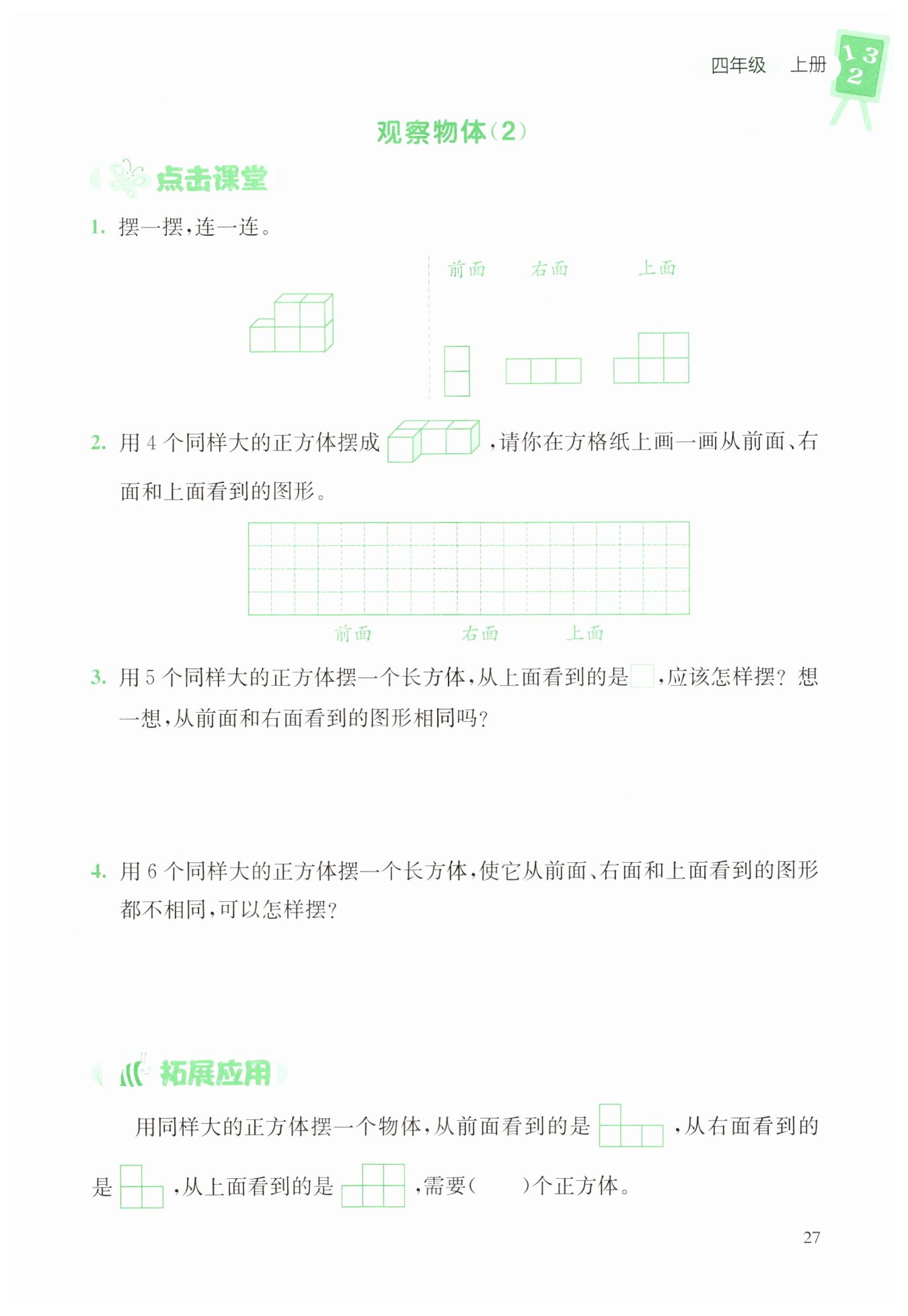 答:第一層橫著擺3個(gè)正方體,第二層也橫著擺3個(gè)正方體。