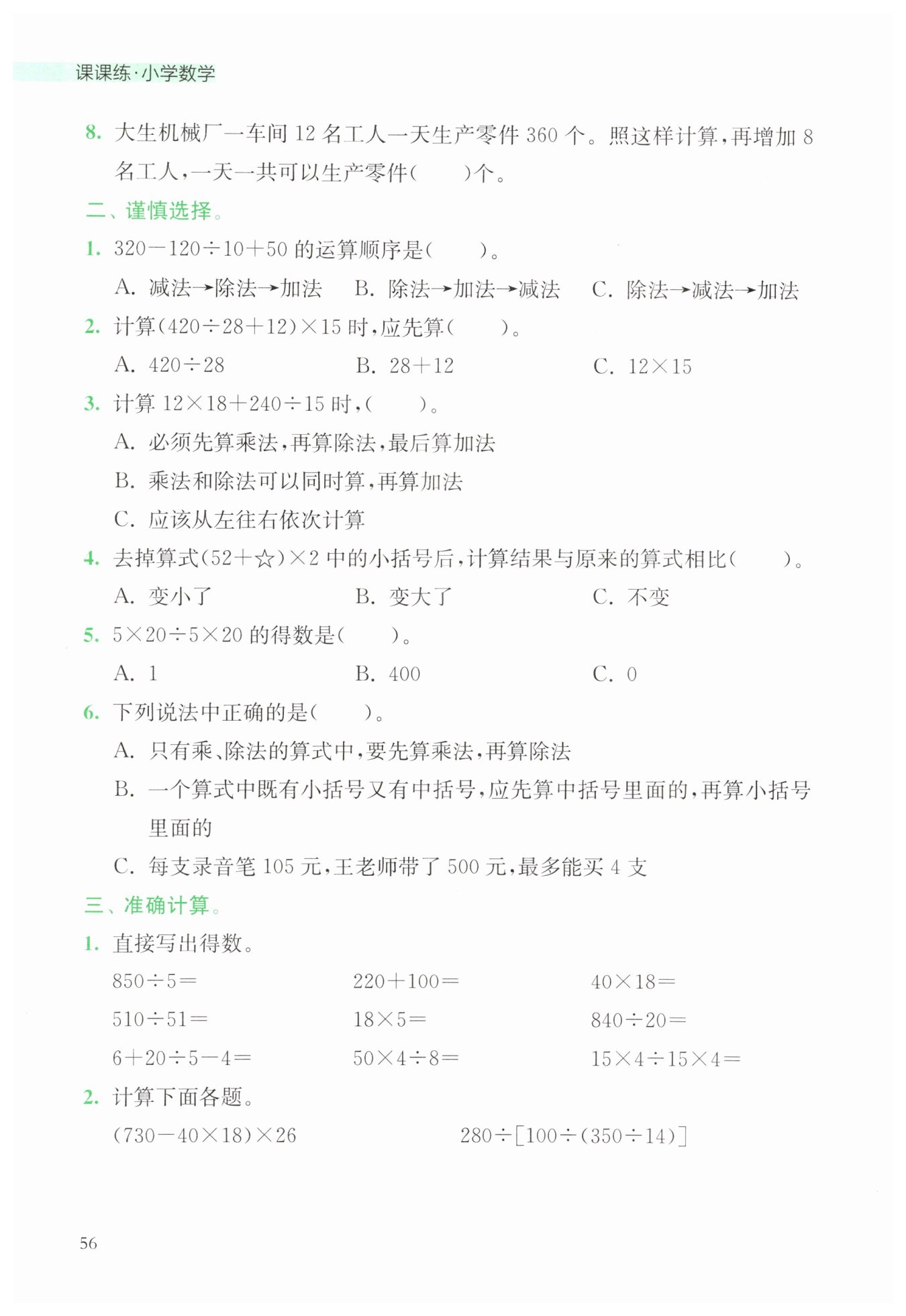 在計算$12×18 + 240÷15$時,根據(jù)數(shù)學(xué)運算順序,乘法和除法屬于同級運算,應(yīng)先算乘除,后算加減,且同級運算可以同時進行。所以先同時計算乘法$12×18$和除法$240÷15$,再將結(jié)果相加。因此,乘法和除法可以同時算,再算加法。