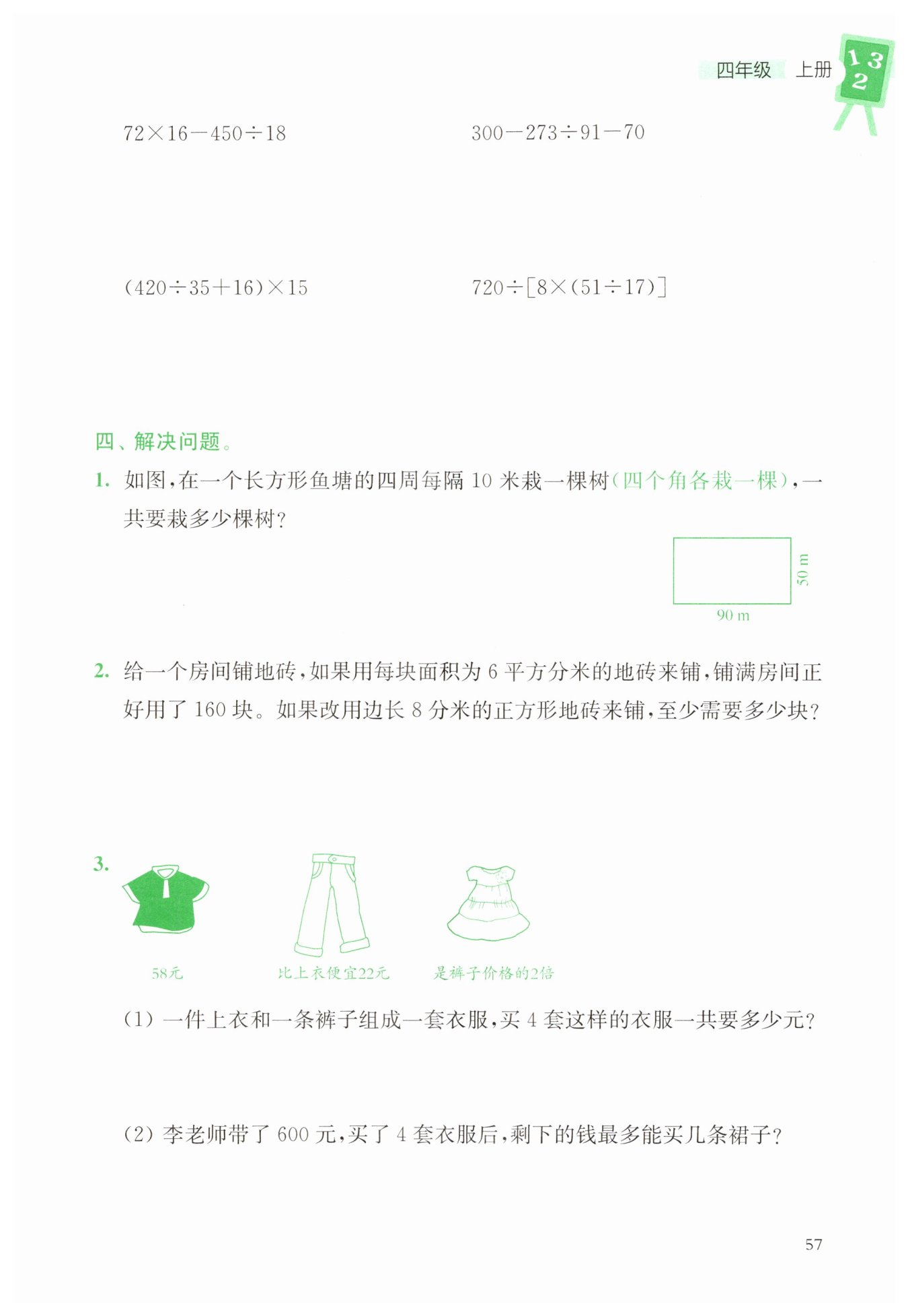 長(zhǎng)方形魚(yú)塘的周長(zhǎng)為$(90 + 50)×2 = 280$(米),每隔10米栽一棵樹(shù),所以樹(shù)的數(shù)量為$280÷10 = 28$(棵)。