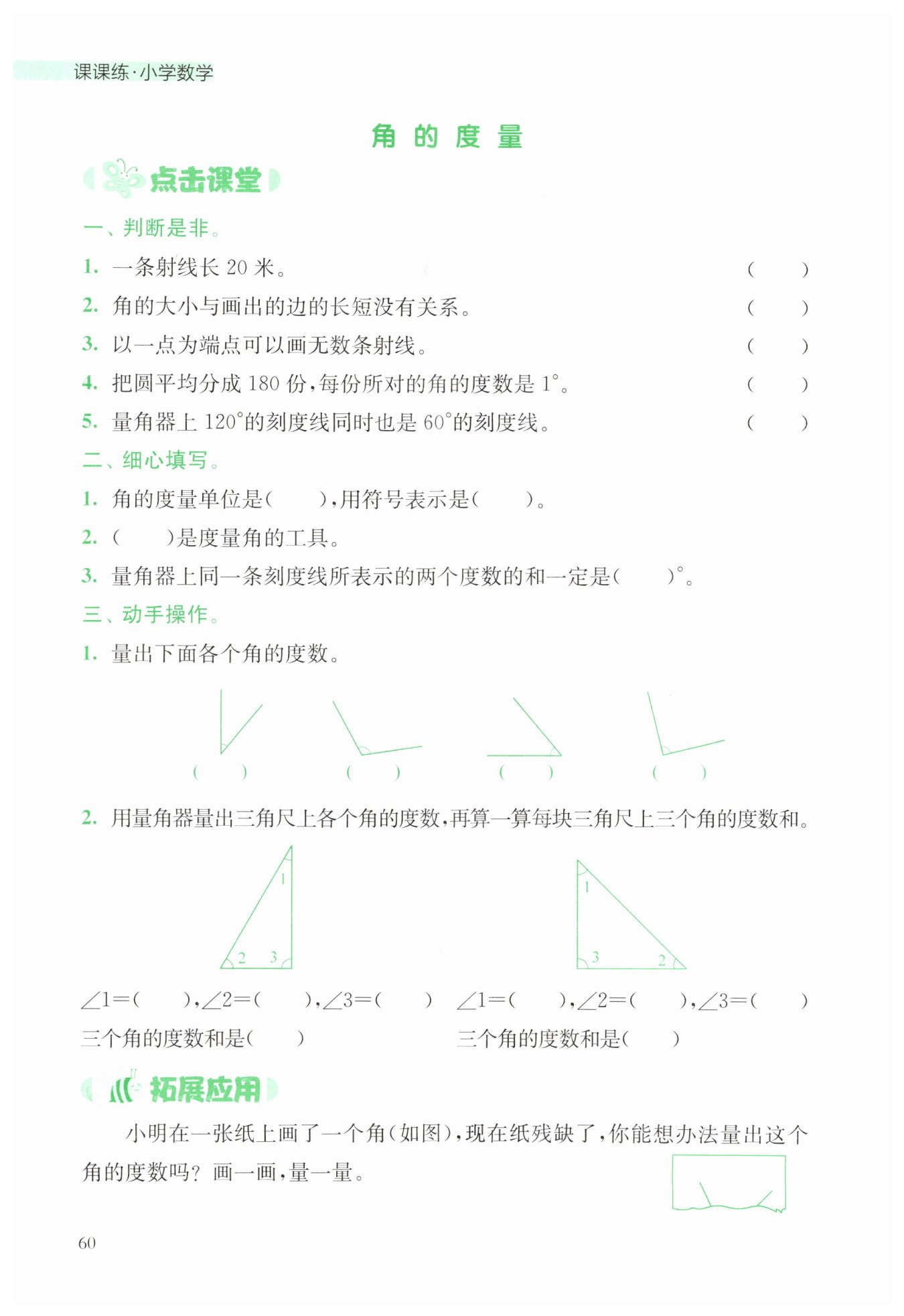 2.角的大小是由其夾角的度數(shù)確定的,與畫出的邊的長短無關,這是正確的。