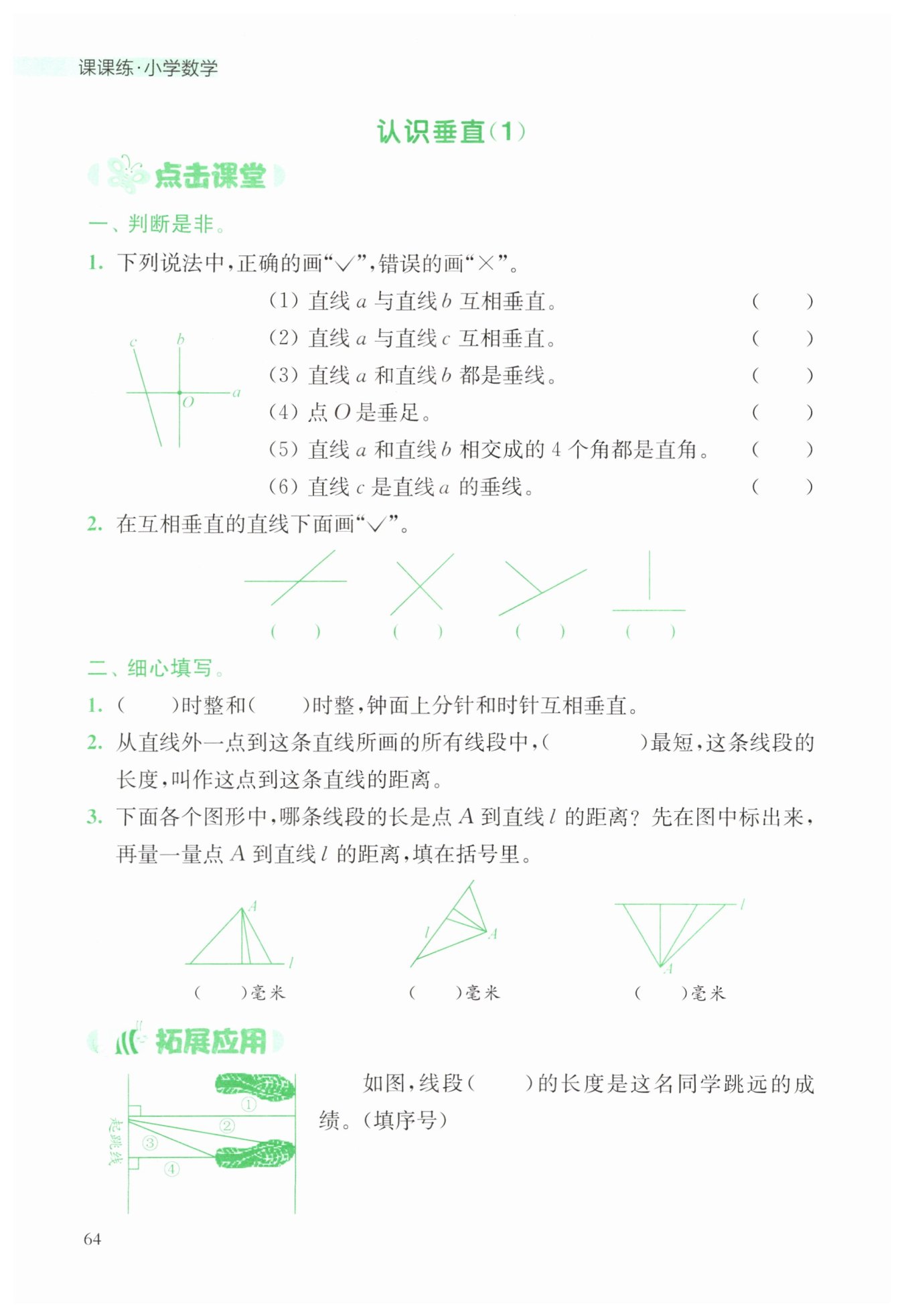 (5)直線a和直線b相交成的4個角都是直角,所以說法正確,畫“√”。