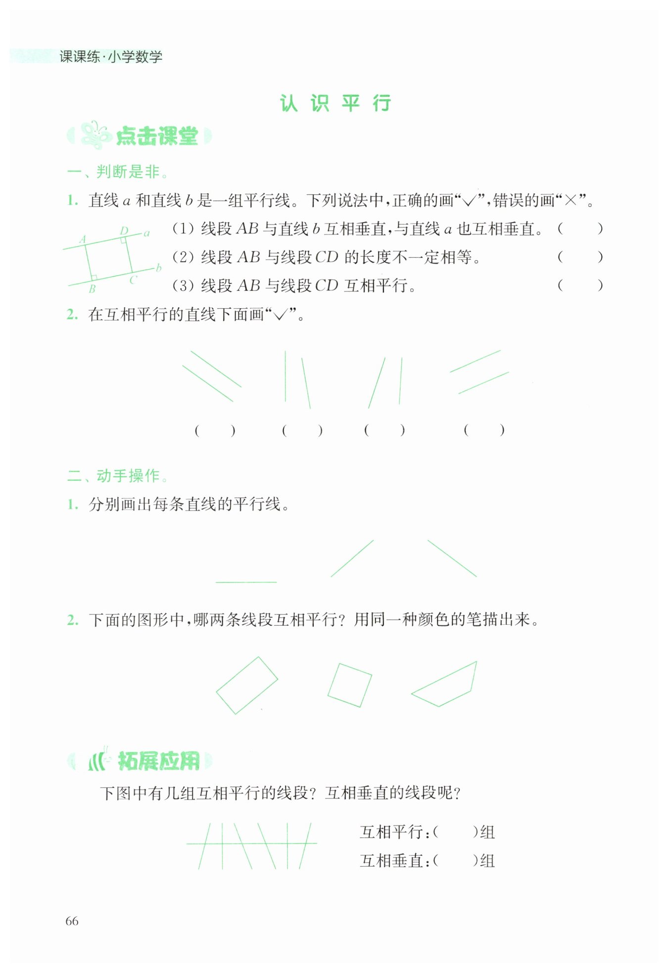 第三個圖形中兩條直線雖然傾斜角度相同,但它們不是直線(是射線),且不滿足平行定義中“不相交”的條件(這里從嚴格意義上講,平行是針對直線而言),不畫“√”;