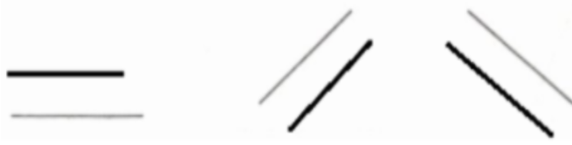 先找互相平行的線段:圖中存在3組方向不同的平行線,每組有2條線段,每組內(nèi)兩條線段互相平行,共3組。再找互相垂直的線段:水平線段與2條豎直線段分別垂直,有2組;另一條水平線段(若有)與這2條豎直線段分別垂直,又有2組,共4組。