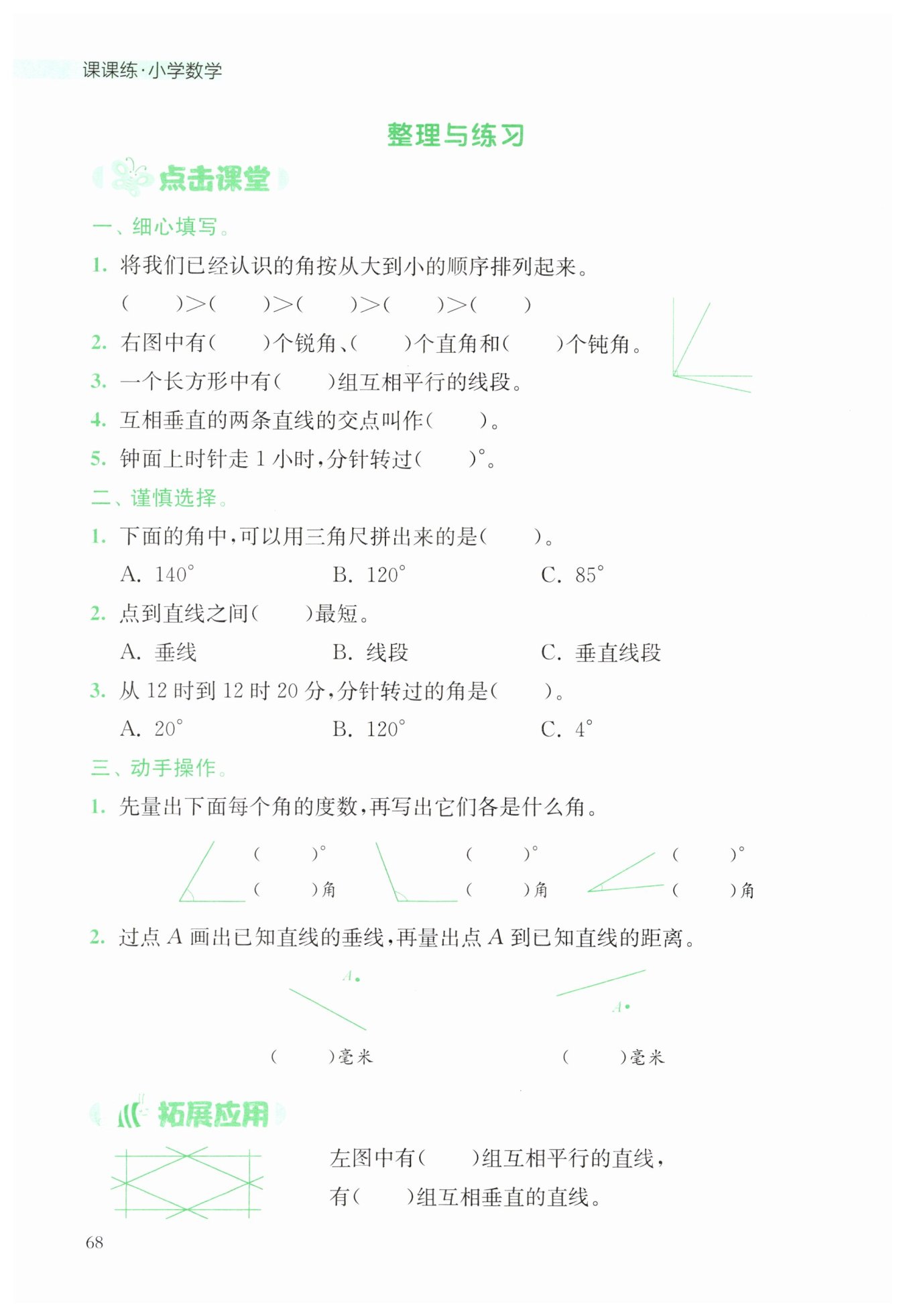 先數(shù)出圖中所有角,單個角有3個(均為銳角),兩個單個角組成的角有2個(均為直角),三個單個角組成的角有1個(為鈍角)。經(jīng)判斷,銳角3個,直角2個,鈍角1個。