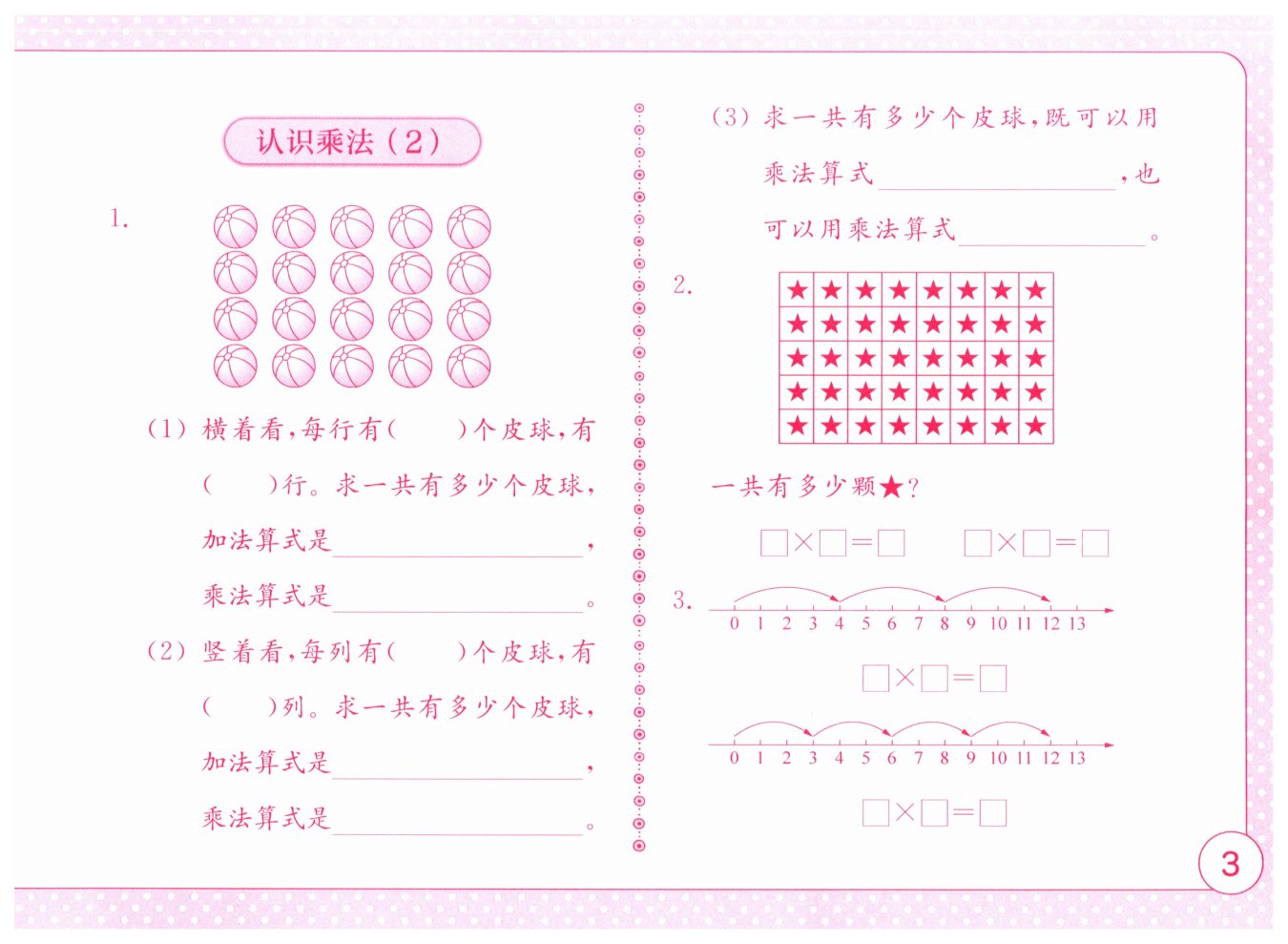 求一共有多少個皮球,加法算式是$5 + 5 + 5 + 5 = 20$,乘法算式是$5×4 = 20$。