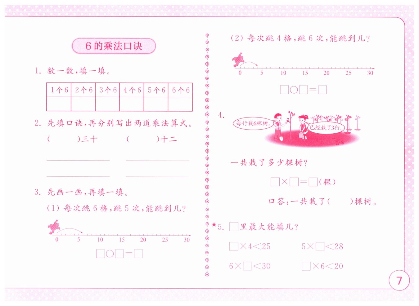 根據(jù)乘法口訣“四六二十四”,$6×4 = 24$,$24\lt 30$;“五六三十”,$6×5 = 30$,不滿足小于$30$的條件,所以□里最大能填$4$。