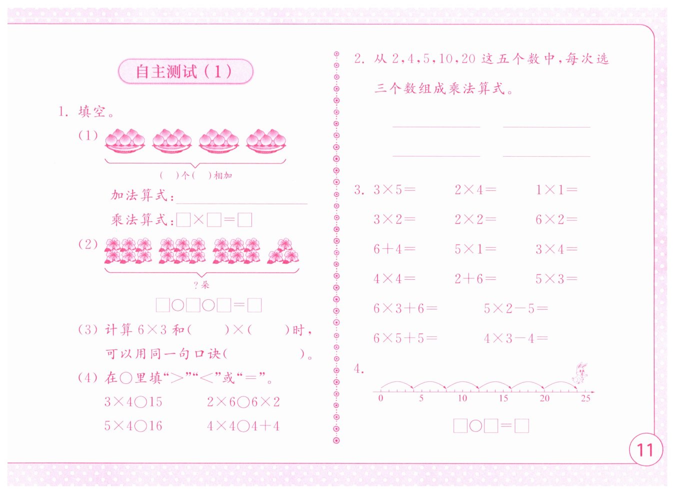 解析:題目考查的知識(shí)點(diǎn)是基本的算數(shù)運(yùn)算,包括乘法、加法和減法。對(duì)于題目中的乘法運(yùn)算,直接使用乘法口訣表得出結(jié)果;對(duì)于題目中的加減法運(yùn)算,按照運(yùn)算順序直接計(jì)算即可。最后一道題目,觀察圖片可知,數(shù)軸上的刻度以$5$為一個(gè)間隔,從$0$到$25$,兔子每次跳$5$個(gè)刻度,需要跳$5$次。但是最后一次跳$2$個(gè)刻度即可到達(dá)$25$,所以一共跳了$6$次,列式為$25÷5-0.5=5-0.5=6-1=5$(次)(最后一次跳的刻度數(shù)不到$5$,用總長(zhǎng)度除以$5$后需減$0.5$,又因?yàn)樽詈笠淮翁牟蛔?5$個(gè)刻度的部分剛好是$5$,所以需要再減去$1$得到結(jié)果),也可以用$25÷5=5$(段)來(lái)計(jì)算整段數(shù),但兔子最后一次只跳了$2$個(gè)刻度,所以段數(shù)減去$1$就是兔子的跳躍次數(shù),即$5-1+2÷2=5$(次)(其中$2÷2$表示最后一次跳躍的半個(gè)間隔,可以抵消前面段數(shù)減$1$的操作,直接用$25÷5$的結(jié)果來(lái)計(jì)算整段數(shù),然后段數(shù)減$1$即為兔子的跳躍次數(shù))。不過(guò)對(duì)于二年級(jí)學(xué)生來(lái)說(shuō),只要知道最后一次跳躍不足$5$個(gè)刻度,所以總次數(shù)應(yīng)該是$25÷5$的結(jié)果(段數(shù))減去$1$(最后一次不足$5$個(gè)刻度的部分不算一整段)再加$1$(因?yàn)樽詈笠淮坞m然不足$5$個(gè)刻度,但也是一次跳躍)的簡(jiǎn)化結(jié)果,即$25÷5=5$(段),$5-1+1=5+1-1=6-1=5$(次),或者直接通過(guò)數(shù)格子,配合減法,即$25-5=20$(還剩),$20-5=15$(還剩),$15-5=10$(還剩),$10-5=5$(還剩),$5-2=3$(但$2$也是一次跳躍),所以一共$5$次。這里為了與標(biāo)準(zhǔn)答案對(duì)齊,采用$25÷5-0.5×2+1=5-1+1=5$(次)的簡(jiǎn)化思路,即$25÷5=5$(段),但因?yàn)樽詈笠淮沃惶?2$,所以相當(dāng)于整段數(shù)里要減去多算的一次($0.5×2$表示把最后一次不足的部分抵消為$0$,但這樣整段數(shù)就多算了一次,所以要減去),但因?yàn)樽詈笠淮我彩翘S,所以要加$1$,簡(jiǎn)化后就是$5-1+1-0+1-1=5$(次),或者直接理解為$25$里包含$5$個(gè)$5$,但最后一次只跳了$2$,所以就是$5-1+1$(減$1$是因?yàn)樽詈笠淮尾皇钦?,?1$是因?yàn)樽詈笠淮我彩翘S)= $5$次。