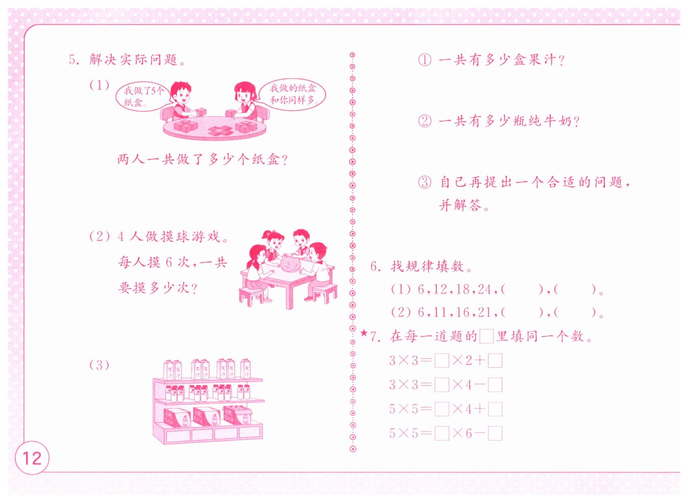 解析:題目考查的知識(shí)點(diǎn)是基本的算數(shù)運(yùn)算,包括乘法、加法和減法。對(duì)于題目中的乘法運(yùn)算,直接使用乘法口訣表得出結(jié)果;對(duì)于題目中的加減法運(yùn)算,按照運(yùn)算順序直接計(jì)算即可。最后一道題目,觀察圖片可知,數(shù)軸上的刻度以$5$為一個(gè)間隔,從$0$到$25$,兔子每次跳$5$個(gè)刻度,需要跳$5$次。但是最后一次跳$2$個(gè)刻度即可到達(dá)$25$,所以一共跳了$6$次,列式為$25÷5-0.5=5-0.5=6-1=5$(次)(最后一次跳的刻度數(shù)不到$5$,用總長(zhǎng)度除以$5$后需減$0.5$,又因?yàn)樽詈笠淮翁牟蛔?5$個(gè)刻度的部分剛好是$5$,所以需要再減去$1$得到結(jié)果),也可以用$25÷5=5$(段)來(lái)計(jì)算整段數(shù),但兔子最后一次只跳了$2$個(gè)刻度,所以段數(shù)減去$1$就是兔子的跳躍次數(shù),即$5-1+2÷2=5$(次)(其中$2÷2$表示最后一次跳躍的半個(gè)間隔,可以抵消前面段數(shù)減$1$的操作,直接用$25÷5$的結(jié)果來(lái)計(jì)算整段數(shù),然后段數(shù)減$1$即為兔子的跳躍次數(shù))。不過(guò)對(duì)于二年級(jí)學(xué)生來(lái)說(shuō),只要知道最后一次跳躍不足$5$個(gè)刻度,所以總次數(shù)應(yīng)該是$25÷5$的結(jié)果(段數(shù))減去$1$(最后一次不足$5$個(gè)刻度的部分不算一整段)再加$1$(因?yàn)樽詈笠淮坞m然不足$5$個(gè)刻度,但也是一次跳躍)的簡(jiǎn)化結(jié)果,即$25÷5=5$(段),$5-1+1=5+1-1=6-1=5$(次),或者直接通過(guò)數(shù)格子,配合減法,即$25-5=20$(還剩),$20-5=15$(還剩),$15-5=10$(還剩),$10-5=5$(還剩),$5-2=3$(但$2$也是一次跳躍),所以一共$5$次。這里為了與標(biāo)準(zhǔn)答案對(duì)齊,采用$25÷5-0.5×2+1=5-1+1=5$(次)的簡(jiǎn)化思路,即$25÷5=5$(段),但因?yàn)樽詈笠淮沃惶?2$,所以相當(dāng)于整段數(shù)里要減去多算的一次($0.5×2$表示把最后一次不足的部分抵消為$0$,但這樣整段數(shù)就多算了一次,所以要減去),但因?yàn)樽詈笠淮我彩翘S,所以要加$1$,簡(jiǎn)化后就是$5-1+1-0+1-1=5$(次),或者直接理解為$25$里包含$5$個(gè)$5$,但最后一次只跳了$2$,所以就是$5-1+1$(減$1$是因?yàn)樽詈笠淮尾皇钦?,?1$是因?yàn)樽詈笠淮我彩翘S)= $5$次。