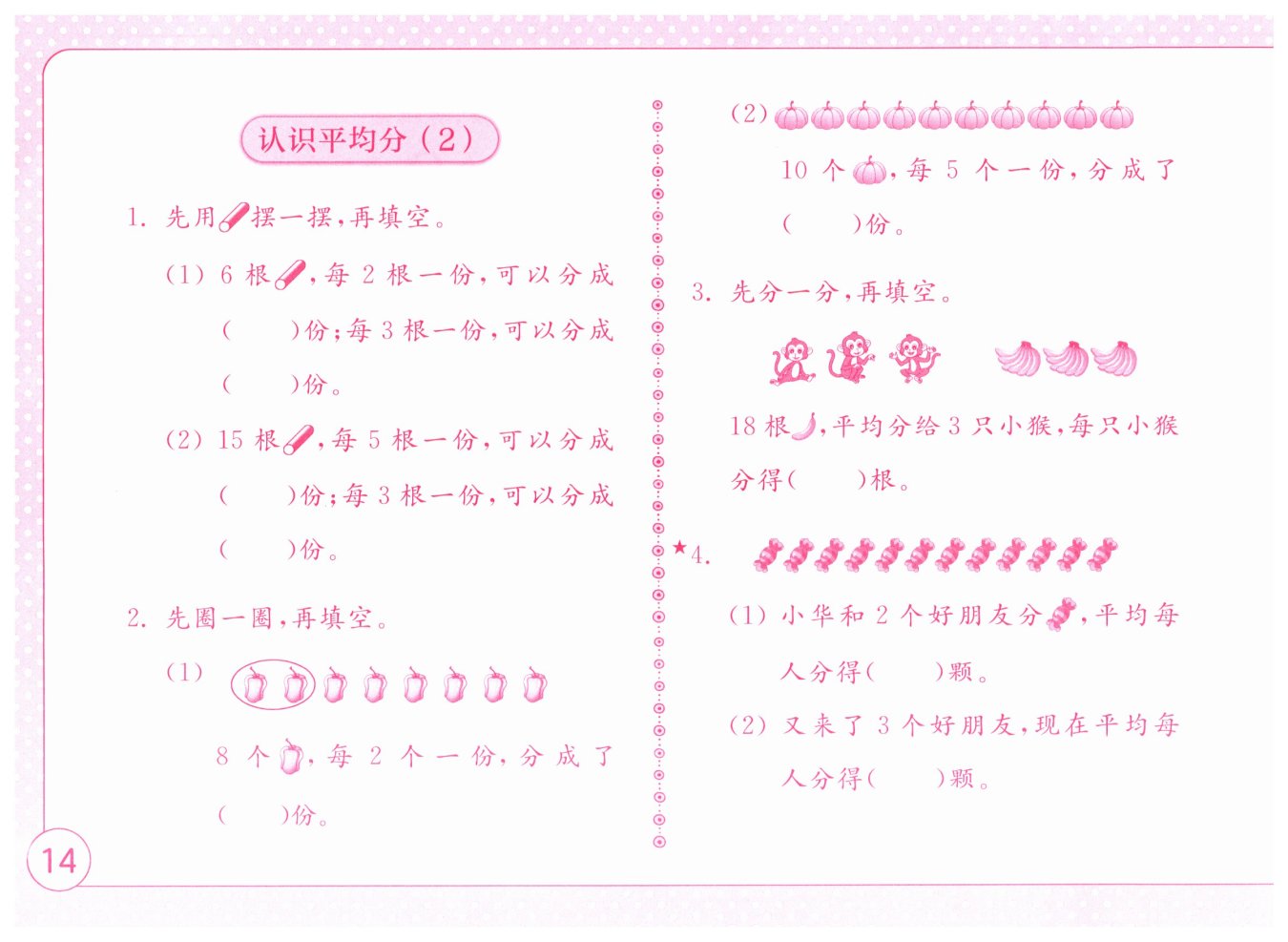 解析:本題主要考查平均分的概念,即把一些物品按照每份相同的數量進行分組,求能分成多少份。我們可以通過實際擺一擺或者用除法運算來得出結果。
