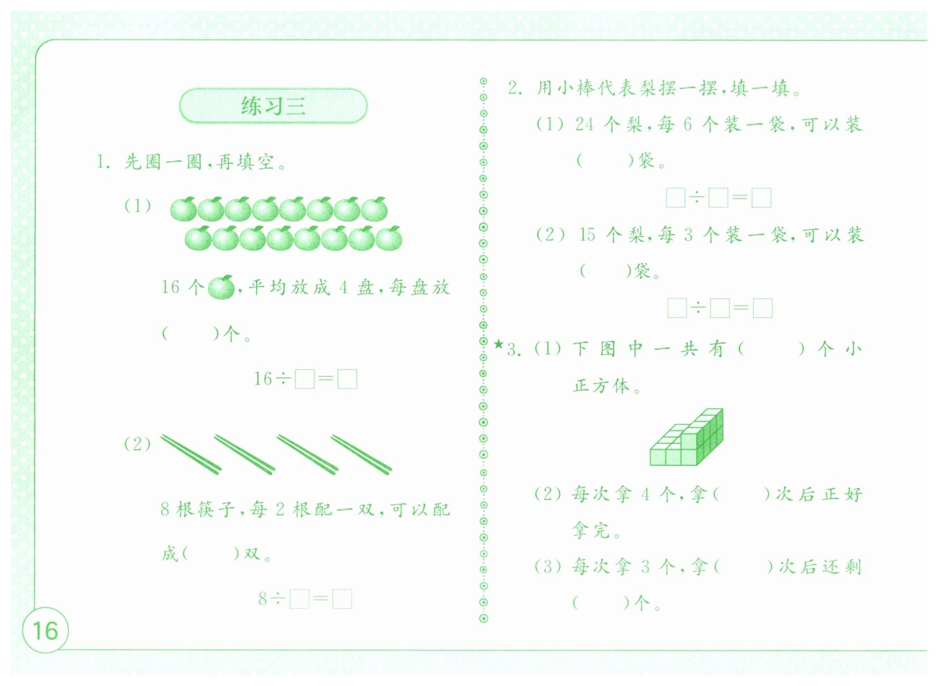 (1) 解析:本題考查除法在實際問題中的應用,通過圈一圈的方式,將$16$個蘋果平均分成$4$盤,求每盤放幾個,用除法計算。
