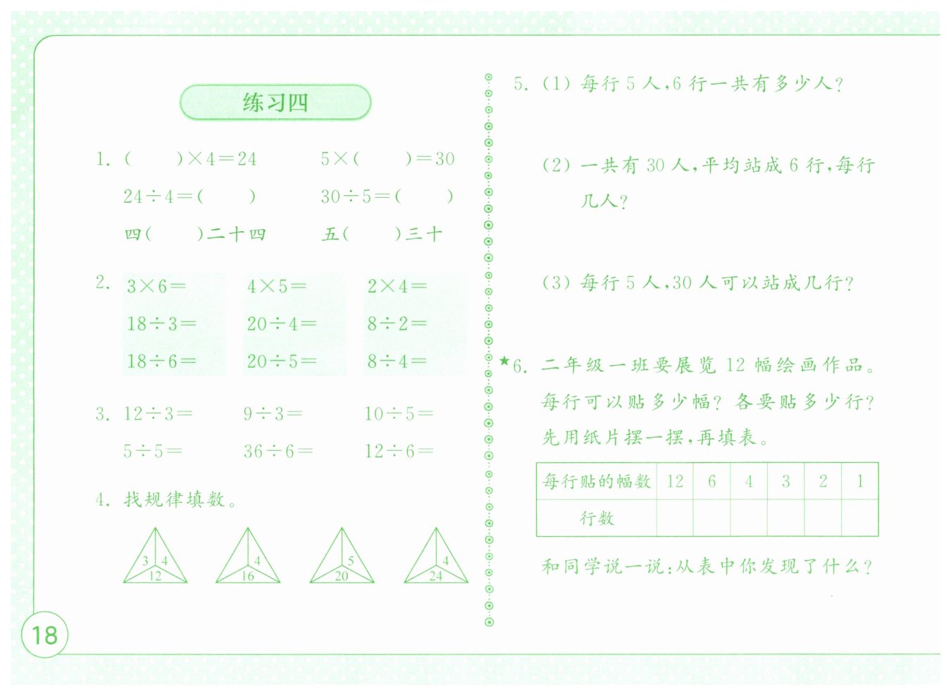 答案:$6×4= 24$,$5×6= 30$,$24÷4= 6$,$30÷5= 6$,四(六)二十四 ,五(六)三十。