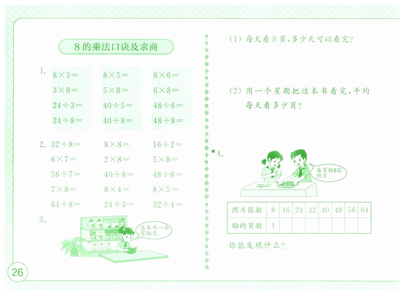 可以發(fā)現(xiàn):每頁貼的照片張數(shù)都是8的倍數(shù),貼的頁數(shù)與照片張數(shù)的對應(yīng)關(guān)系符合8的乘法口訣。