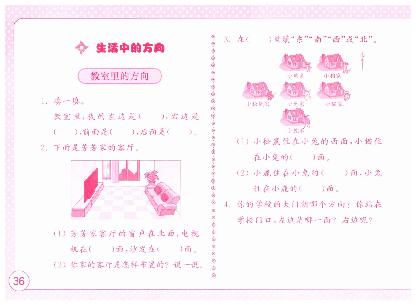 (2)從圖中可知小鹿住在小兔的下面,根據(jù)“上北下南,左西右東”,下面是南面,所以小鹿住在小兔的南面;而小兔住在小鹿的上面,上面是北面,所以小兔住在小鹿的北面。