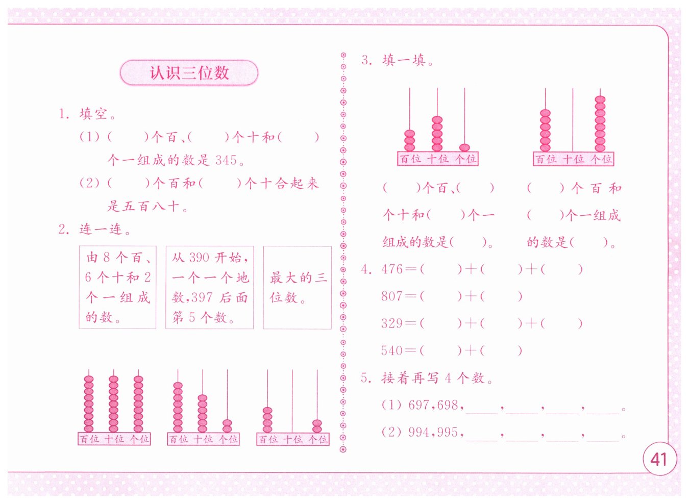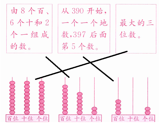 答案:將第一個計數(shù)器與“由8個百、6個十和2個一組成的數(shù)”相連;將第二個計數(shù)器與“從390開始,一個一個地數(shù),397后面第5個數(shù)”相連;將第三個計數(shù)器與“最大的三位數(shù)”相連。