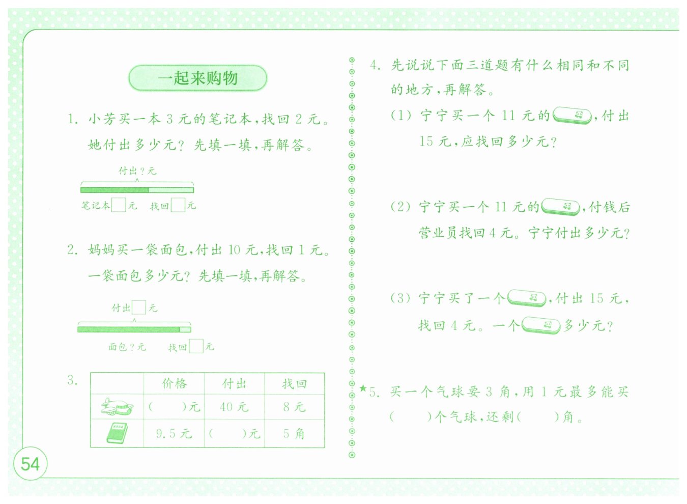 第二行付出:$5角 = 0.5元$,$9.5 + 0.5 = 10$(元)。