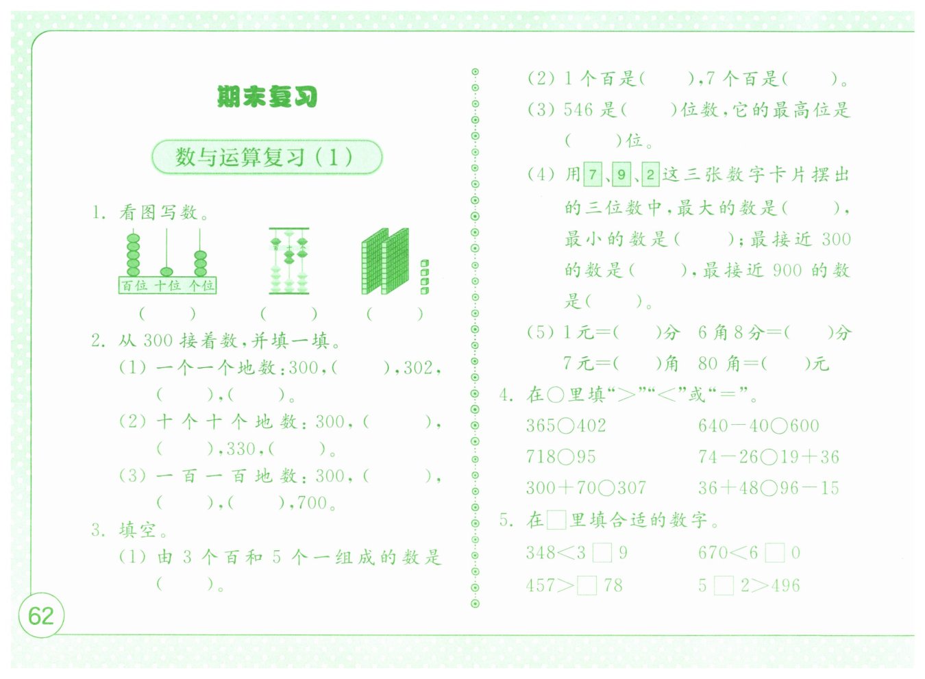解析:本題考查的是數(shù)數(shù),包括一個一個地數(shù),十個十個地數(shù),一百一百地數(shù)的情況。需要根據(jù)不同的數(shù)數(shù)方式,在給定的數(shù)字之間填入缺失的數(shù)字。
