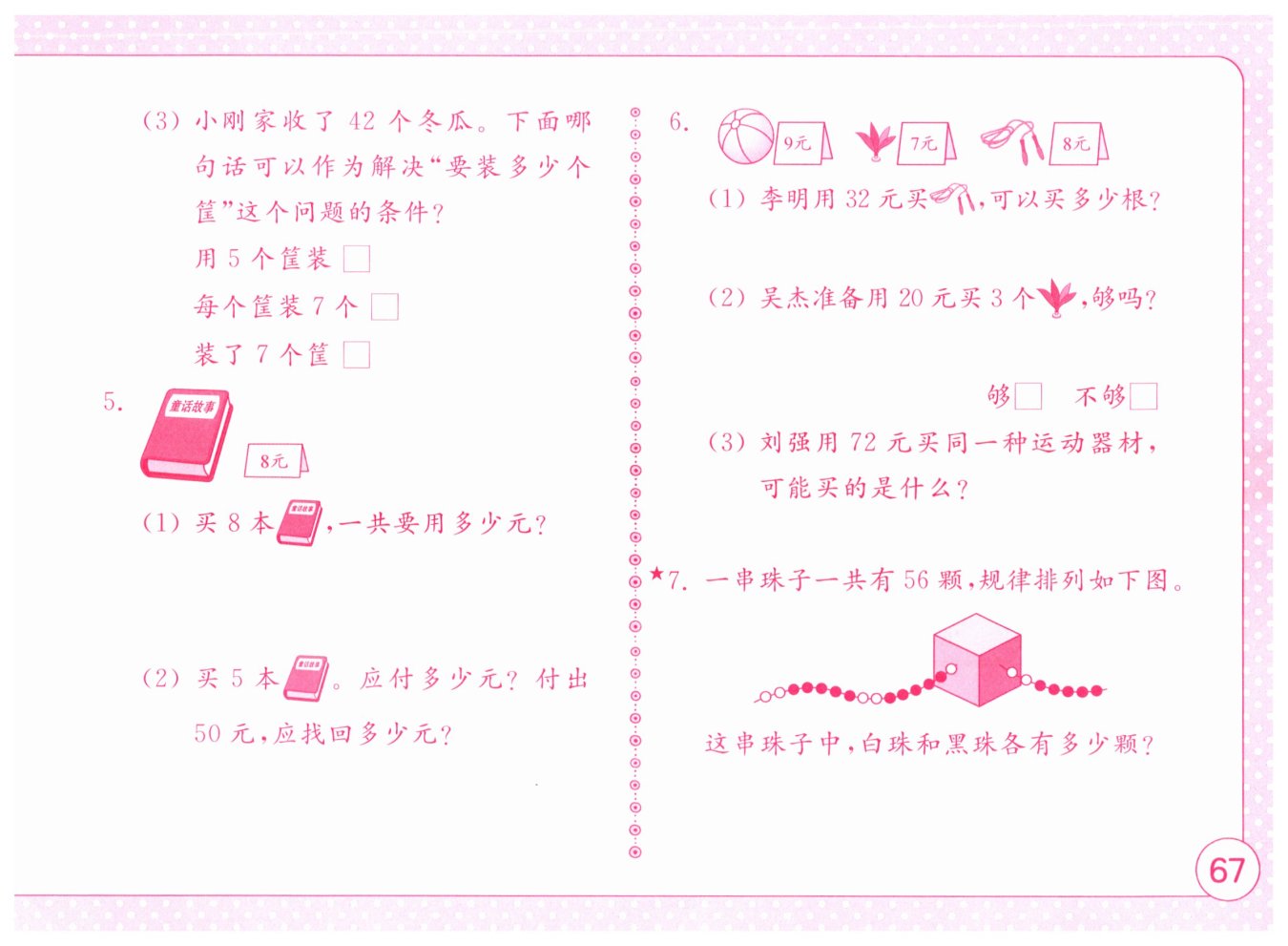 (3)用 5 個筐裝□ 每個筐裝 7 個√ 裝了 7 個筐□