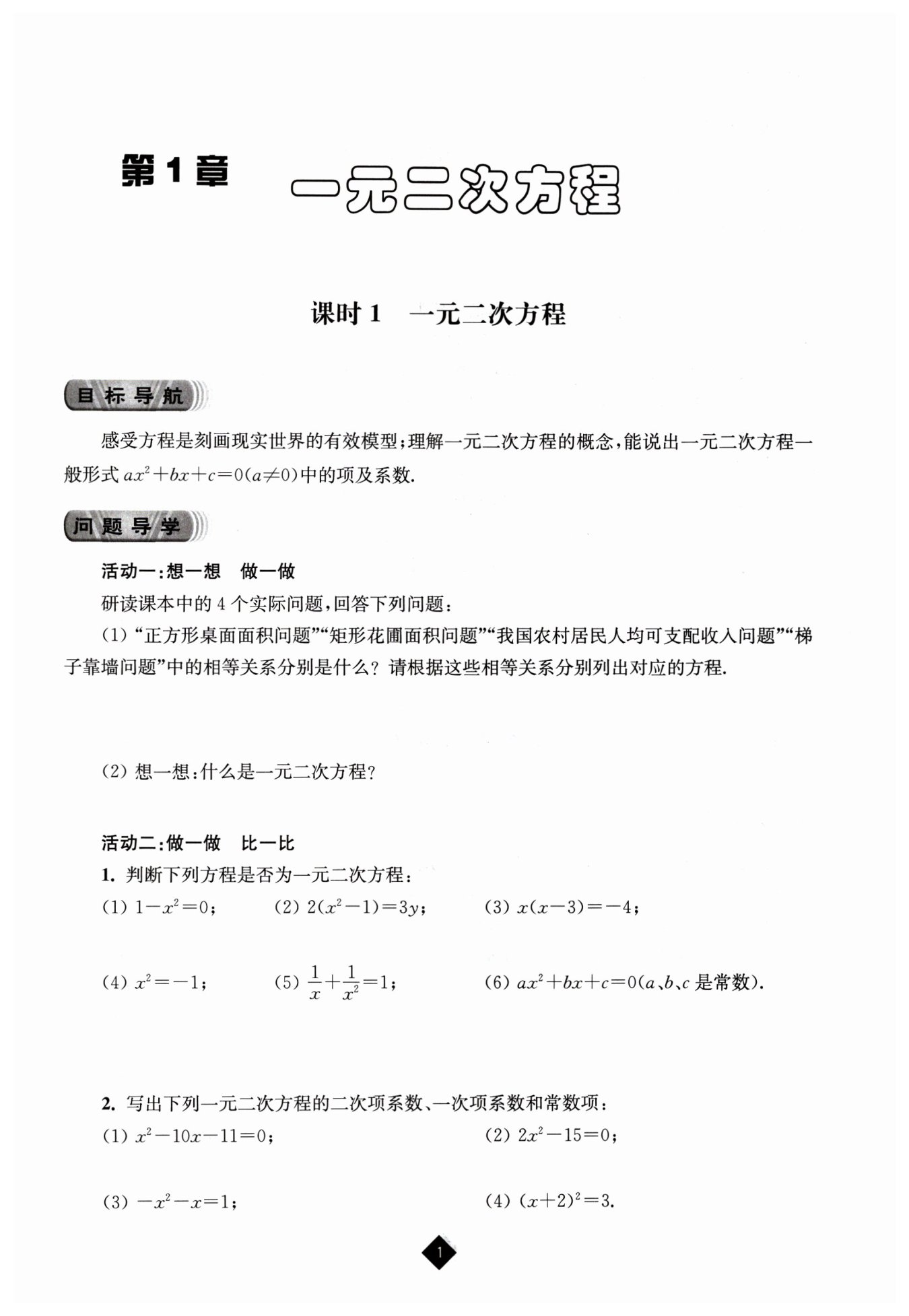 (1)①正方形桌面面積問題:相等關(guān)系為正方形邊長的平方等于面積,方程為x2=2;②矩形花圃面積問題:相等關(guān)系為矩形的長×寬=面積,方程為x(10-x)=24;③農(nóng)村居民人均可支配收入問題:相等關(guān)系為初始收入×(1+年平均增長率)2=最終收入,方程為a(1+x)2=b;④梯子靠墻問題:相等關(guān)系為(底端距墻距離)2+(頂端距地距離)2=梯子長度2(勾股定理),方程為(3+x)2+(4-x)2=25。(2)只含有一個(gè)未知數(shù),且未知數(shù)的最高次數(shù)是2的整式方程叫做一元二次方程。