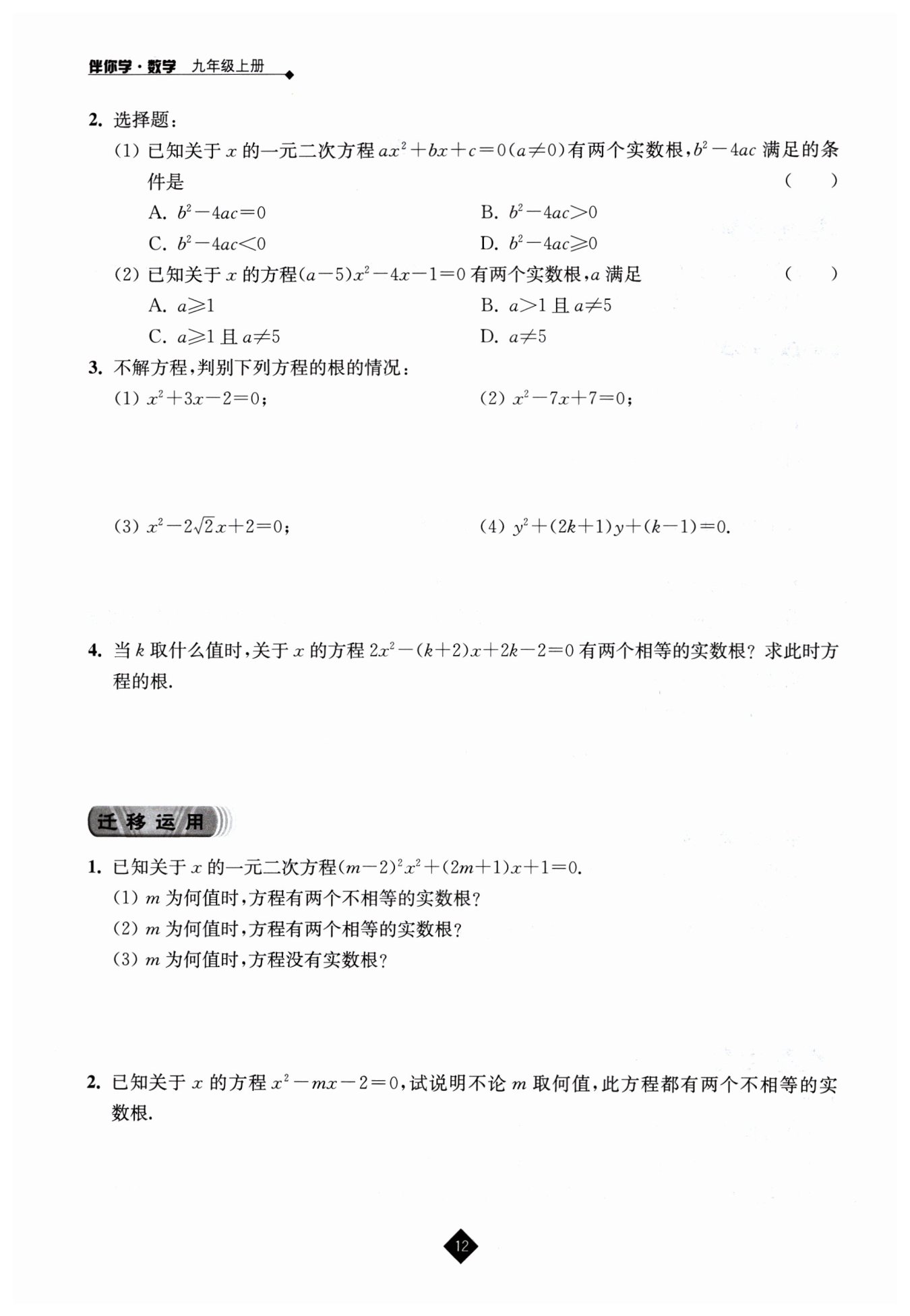 (3) 方程$x^2 - mx + 3 = 0$有實(shí)數(shù)根,判別式$\Delta = (-m)^2 - 4×1×3 = m^2 - 12 ≥ 0$,取$m = 4$(滿足$m^2 ≥ 12$即可)。