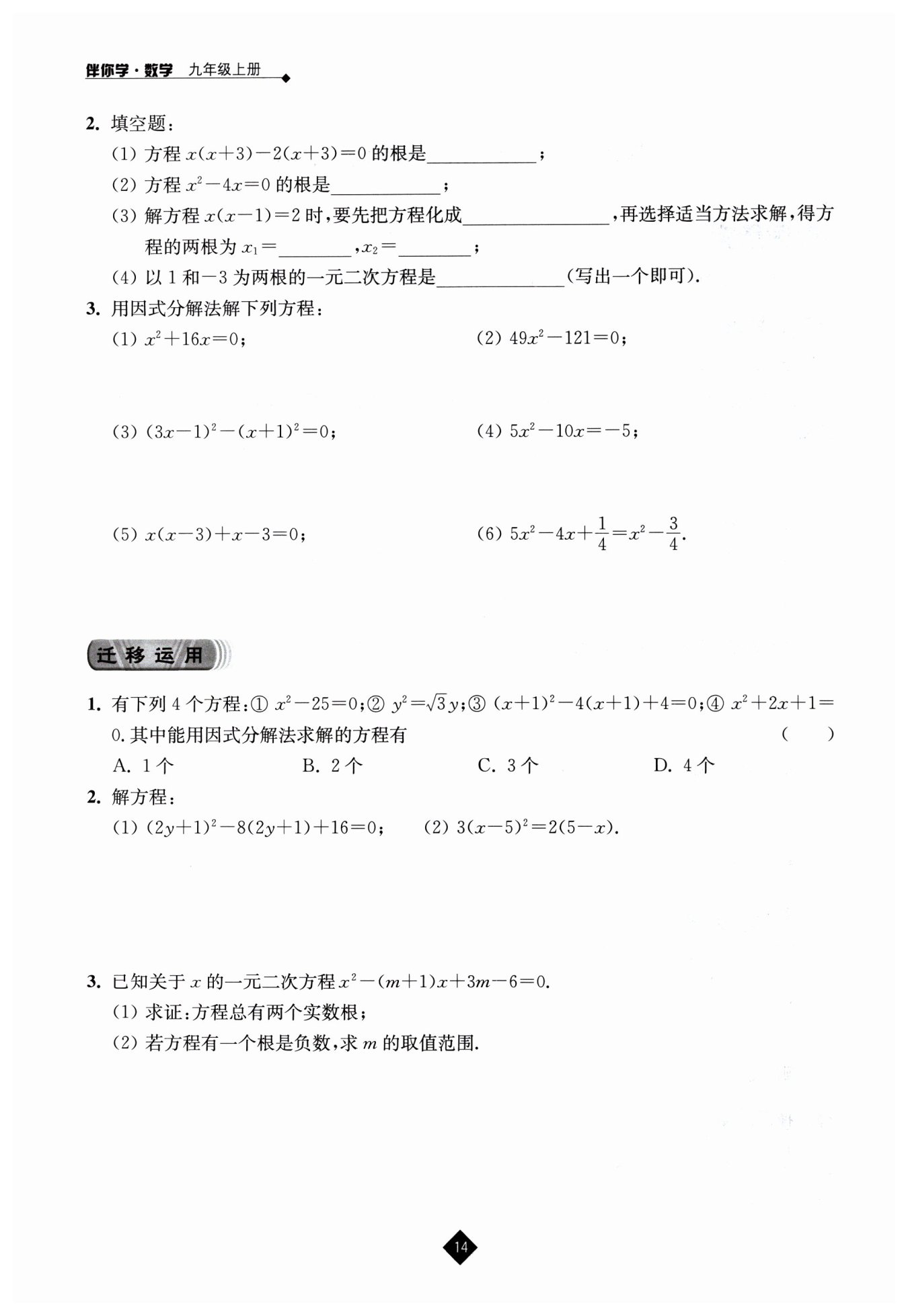 (1) $x(x + 3) - 2(x + 3) = 0$,提取公因式得$(x + 3)(x - 2) = 0$,則$x + 3 = 0$或$x - 2 = 0$,解得$x_1 = -3$,$x_2 = 2$。