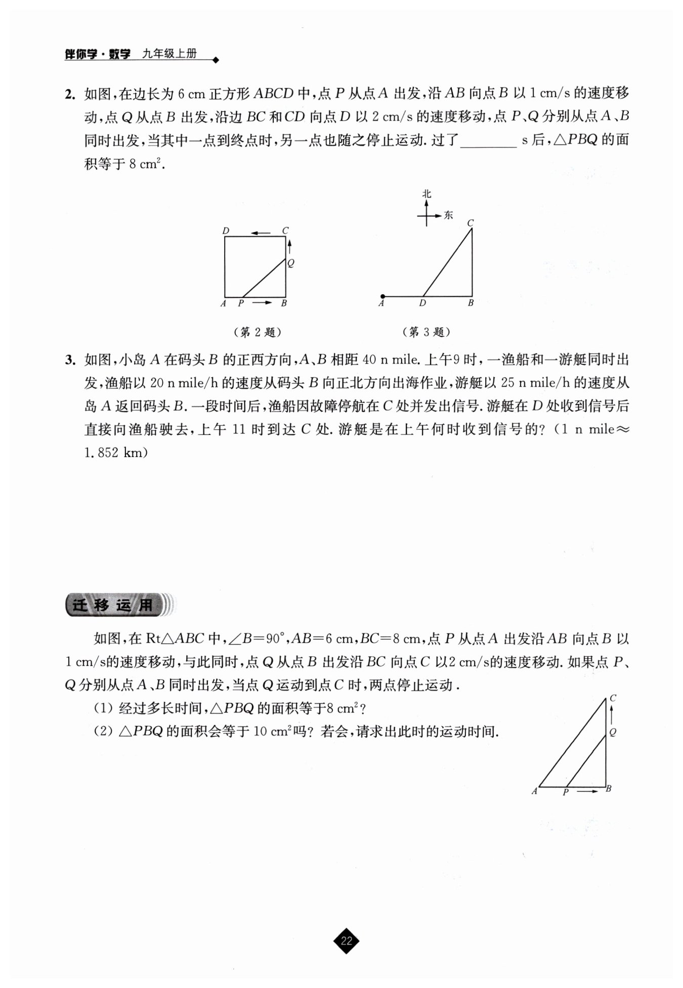 漁船從上午9時(shí)出發(fā),到上午11時(shí)共行駛了2小時(shí),速度為20 n mile/h,所以漁船行駛的路程$ BC = 20×2 = 40 $ n mile,即C點(diǎn)在B點(diǎn)正北方向40 n mile處。