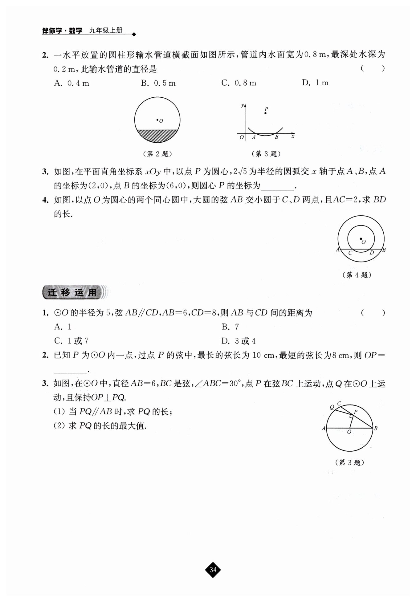 設(shè)圓的半徑為$r$米,過圓心$O$作弦$AB$(水面寬)的垂線,垂足為$C$,則$AC = \frac{0.8}{2} = 0.4$米。由水深$0.2$米,得圓心到水面距離$OC = r - 0.2$。在$Rt\triangle OAC$中,$OA^2 = AC^2 + OC^2$,即$r^2 = 0.4^2 + (r - 0.2)^2$。解得$r = 0.5$,直徑為$2r = 1$米。