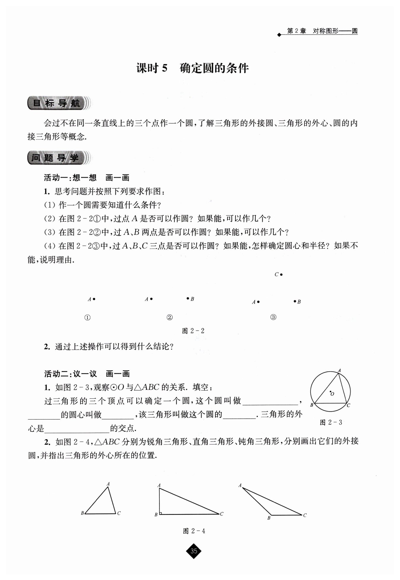 分別作 $AB$,$BC$ 的垂直平分線,交點(diǎn)為 $O$,以 $O$ 為圓心,$OA$ 長(zhǎng)為半徑作圓,$\odot O$ 即為 $\triangle ABC$ 的外接圓,外心 $O$ 在三角形內(nèi)部。