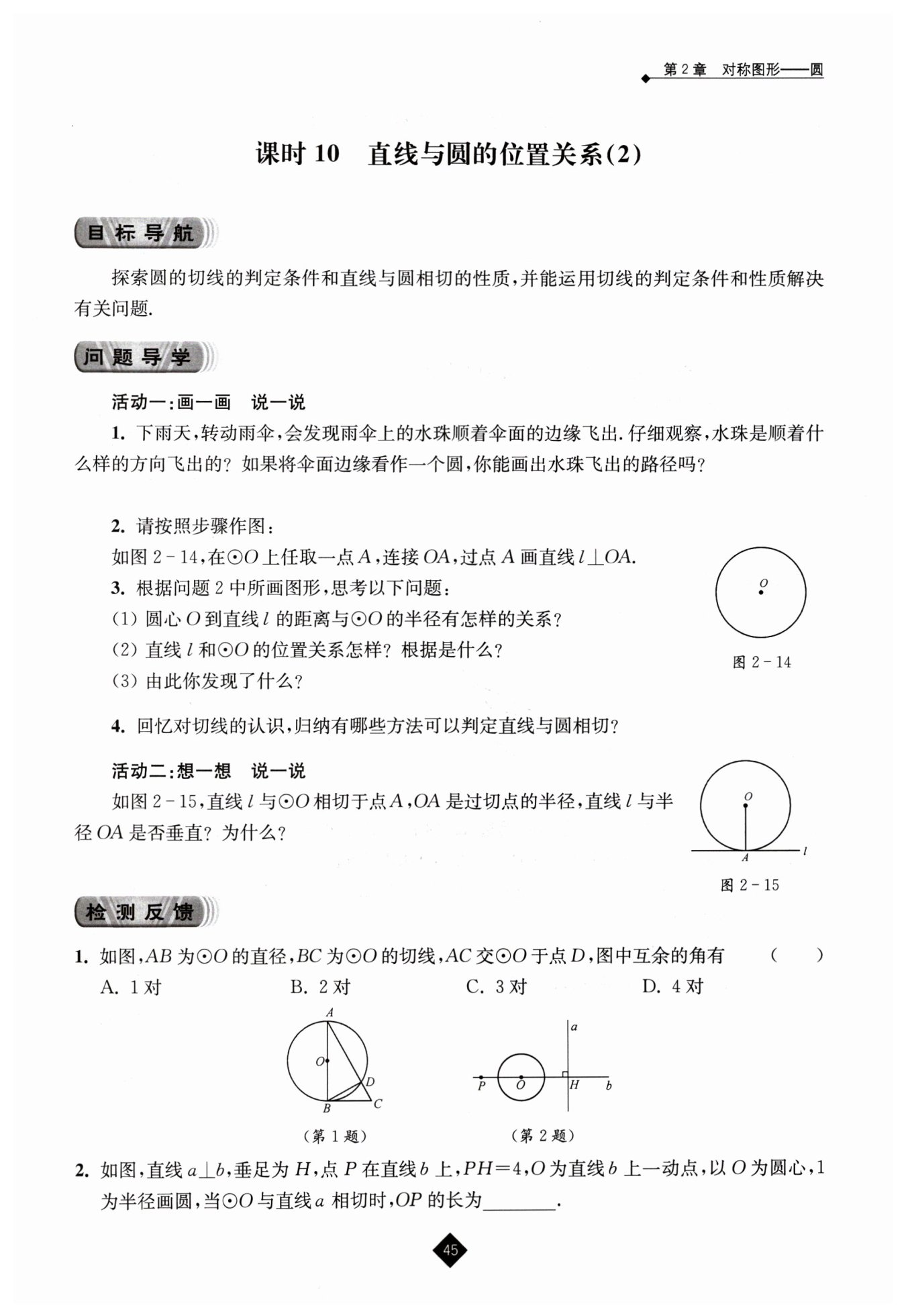 3. (1)圓心O到直線l的距離等于⊙O的半徑;(2)直線l和⊙O相切,根據(jù)是圓心到直線的距離等于半徑;(3)經(jīng)過半徑的外端并且垂直于這條半徑的直線是圓的切線。