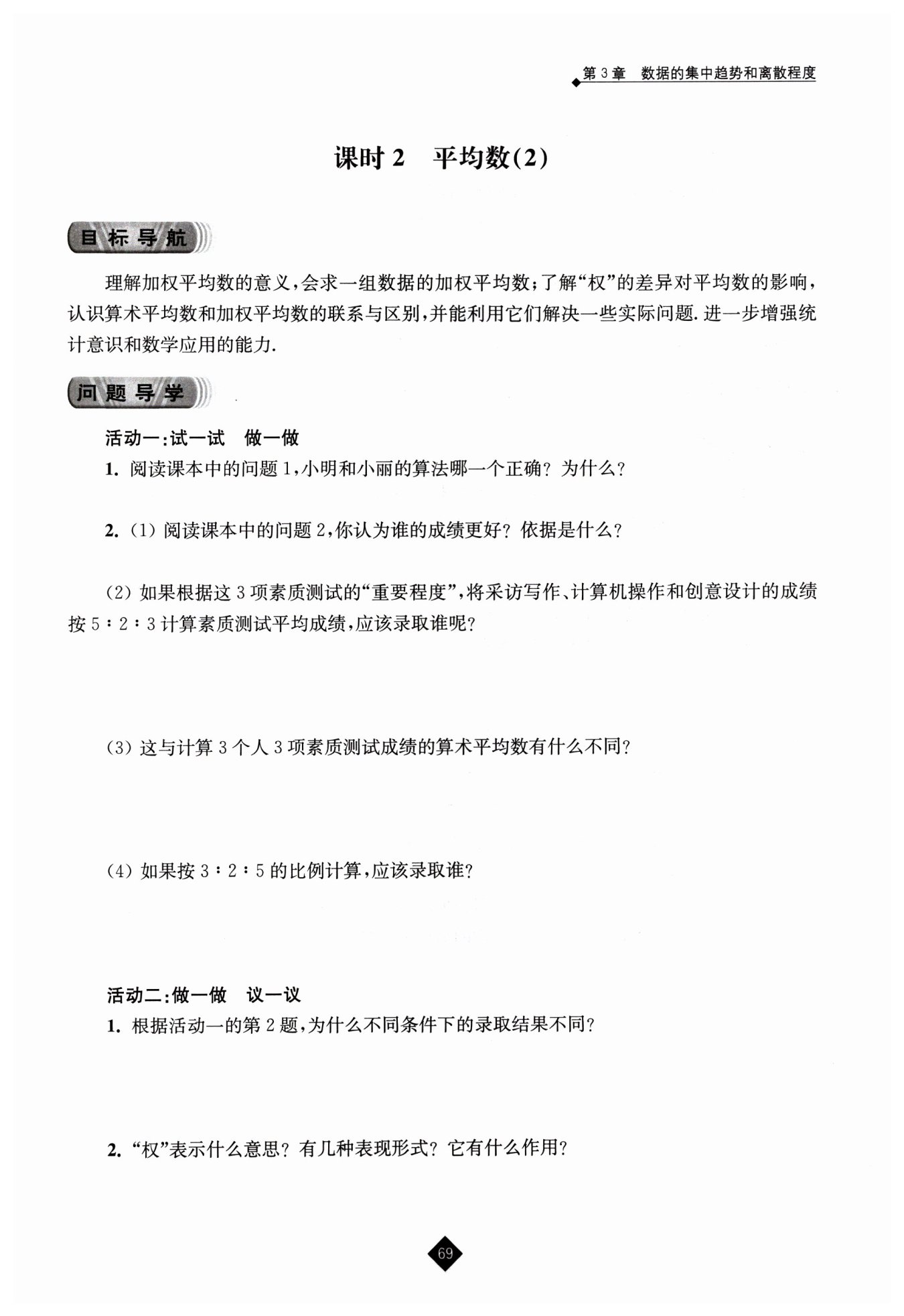 計(jì)算3個(gè)人3項(xiàng)比賽成績的算術(shù)平均數(shù)時(shí),是將每一個(gè)數(shù)據(jù)看作是同等重要的,而2中計(jì)算3個(gè)人的競賽成績時(shí),分別給了每個(gè)數(shù)據(jù)一個(gè)“權(quán)”,以體現(xiàn)各個(gè)數(shù)據(jù)不同的重要程度.