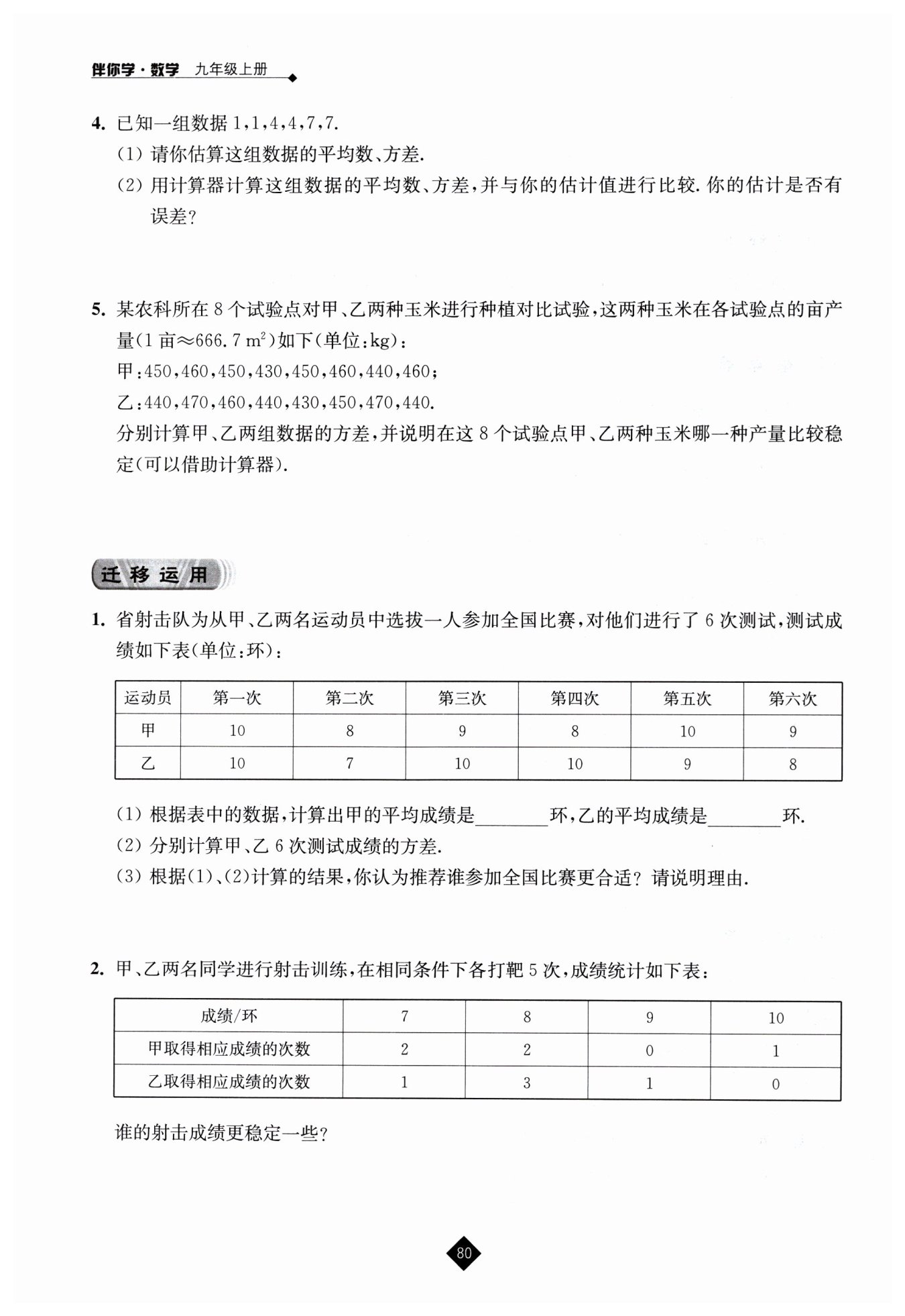 因為 s^2_乙 = 0.4 < s^2_甲 = 1.2,所以乙的射擊成績更穩(wěn)定。 $$