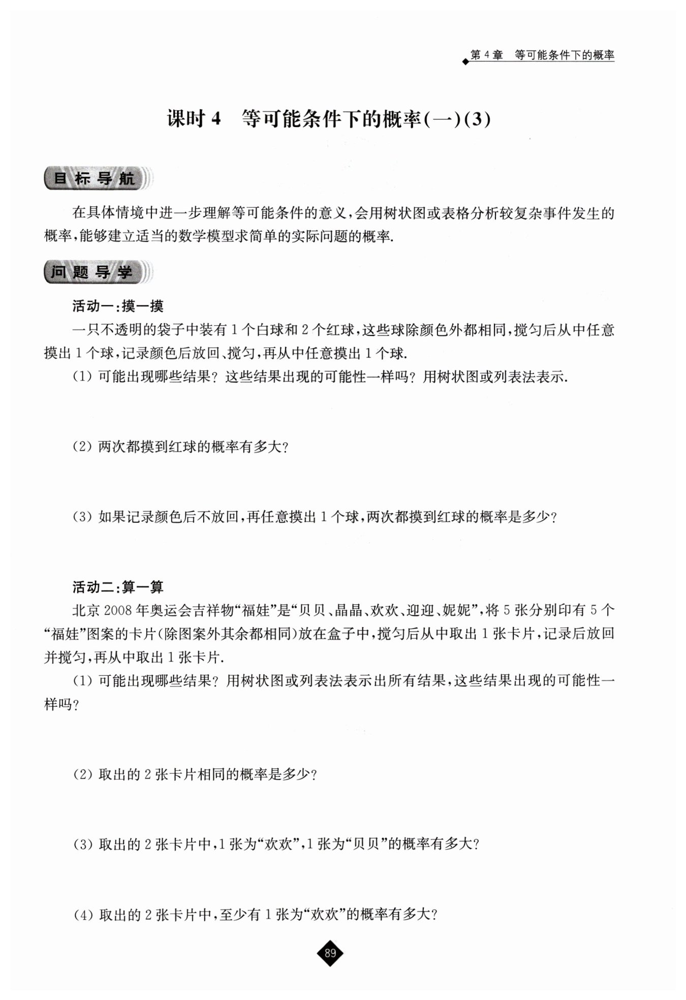 【解析】: (1)設(shè)貝貝、晶晶、歡歡、迎迎、妮妮分別為B、J、H、Y、N。列表如下: | 第二次\第一次 | B | J | H | Y | N | |--------------|-----|-----|-----|-----|-----| | B | (B,B)| (J,B)| (H,B)| (Y,B)| (N,B)| | J | (B,J)| (J,J)| (H,J)| (Y,J)| (N,J)| | H | (B,H)| (J,H)| (H,H)| (Y,H)| (N,H)| | Y | (B,Y)| (J,Y)| (H,Y)| (Y,Y)| (N,Y)| | N | (B,N)| (J,N)| (H,N)| (Y,N)| (N,N)| 共有25種等可能結(jié)果,這些結(jié)果出現(xiàn)的可能性一樣。 (2)2張卡片相同的結(jié)果有5種,概率為5/25=1/5。 (3)1張“歡歡”1張“貝貝”的結(jié)果有2種,概率為2/25。 (4)至少有1張“歡歡”的結(jié)果有9種,概率為9/25。